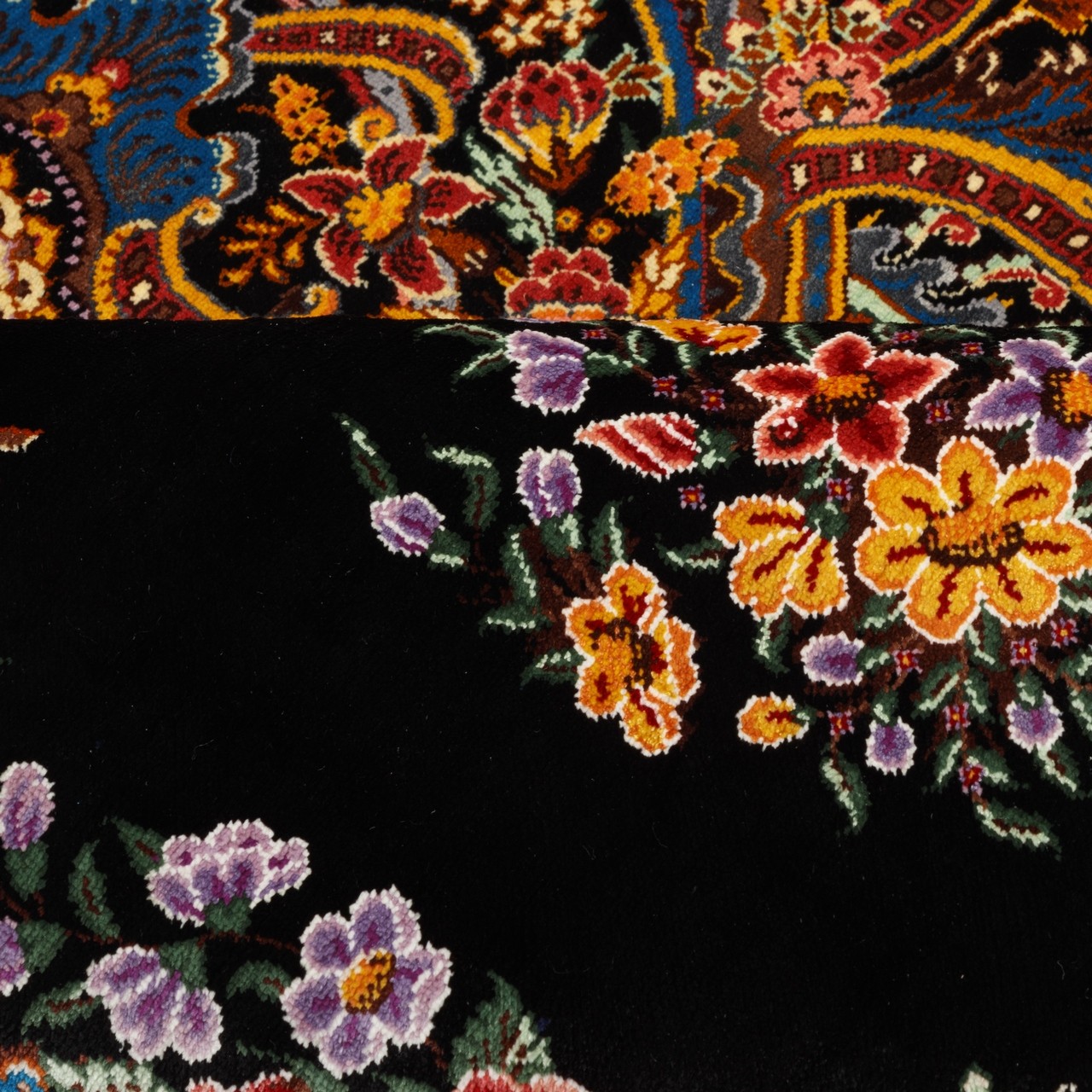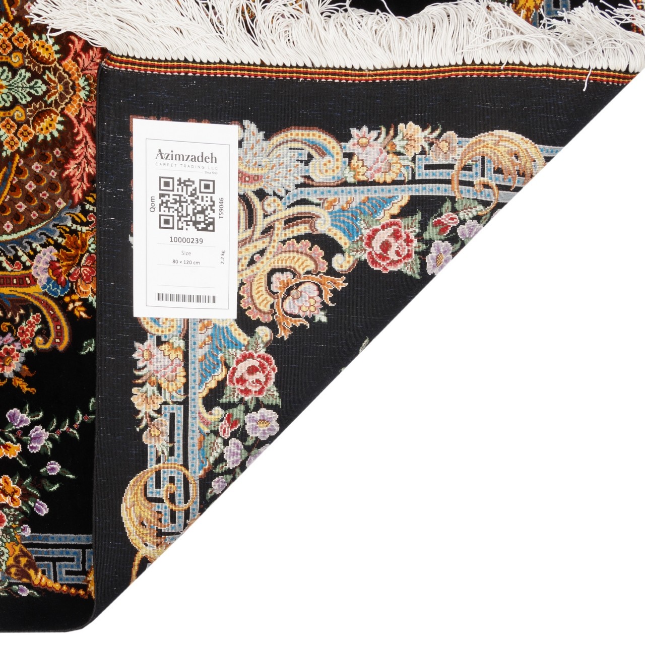 این فرش دستباف تمام ابریشم، با رجشمار ۷۰، از قم، شهری که آوازه‌ی بافت فرشهای ابریشمی و پرنقش‌ونگارش به مرزهای دور رسیده، بافته شده است. فرش با برند «محمد مروج» در ابعاد ۸۰ × ۱۲۰ سانتی‌متر، با مساحتی در حدود ۰.۹۶ متر مربع و طرح لچک ترنج تولید شده است. آن‌چه این فرش را متمایز می‌سازد، رنگ‌پردازی جسورانه آن است؛ زمینه و حاشیه‌ای مشکی، که با درخشش طبیعی ابریشم، شکوهی رازآلود و اشرافی به فرش بخشیده است. در میان زمینه مشکی، گل‌ها چون ستارگانی درخشان می‌درخشند و تعادلی دل‌فریب میان نور و سایه را رقم می‌زنند. نقوش گلدار به اوج لطافت بصری رسیده است. این تضاد هنرمندانه، نه‌تنها بیانگر مهارت بالای بافنده است، بلکه نگاهی معاصر به یک طرح کلاسیک را پیش روی مخاطب می‌گذارد. فرشی که فراتر از یک عنصر تزئینی، به‌مثابه تابلویی از ظرافت و هویت ایرانی است.