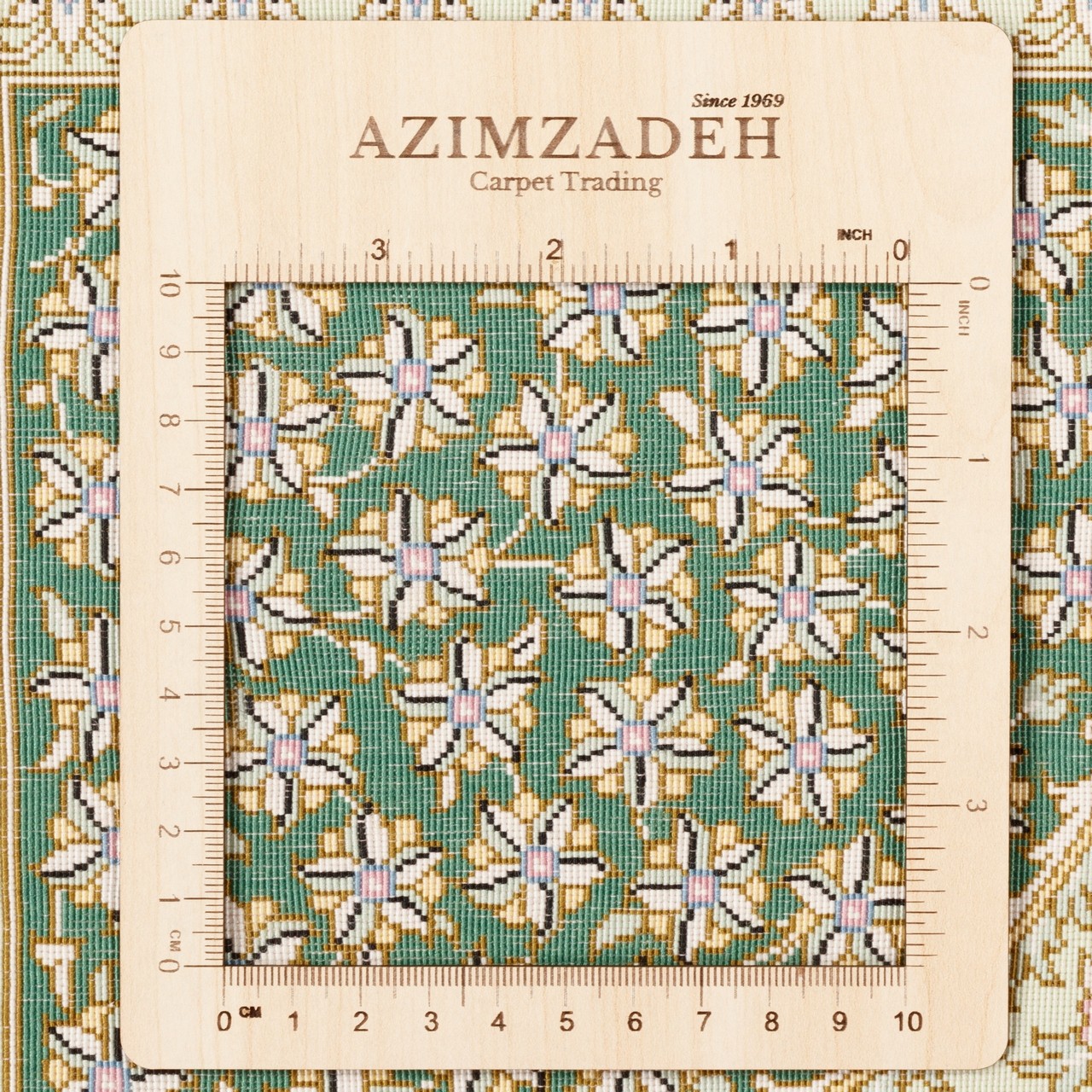 این فرش دستباف، در اندازه‌ی ۱۰۰ × ۱۴۵ سانتی‌متر و مساحت ۱.۴۵ متر مربع، در قالبی مستطیل‌شکل و ساختاری متقارن، جلوه‌ای منحصر به‌فرد از ترکیب رنگ و طراحی را به نمایش گذاشته است. طرح ترنج‌دار این فرش، با الهام از هندسه‌ی مقدس و مفاهیم معنوی، در مرکز فرش جای گرفته و با گل‌بوته‌هایی لطیف و منظم در اطراف آن احاطه شده است؛ طرحی که با نقش‌های گلدار در بدنه‌ی اصلی، وحدت میان طبیعت و هنر را بازتاب می‌دهد. این فرش حاصل برند «خاکی» و با رجشمار 70 بافته شده است. رنگ زمینه‌ی سبز سدری، که یادآور طراوت باغ‌های ایرانی‌ست، در کنار حاشیه‌ای با رنگ سبز یشمی، آرامش و وقاری کم‌نظیر به اثر بخشیده است. این انتخاب رنگی هوشمندانه، روحی سبز و دل‌نشین به فضا می‌بخشد و با نور طبیعی، درخششی گرم و متفاوت می‌یابد. این فرش تمام ابریشم قمی، به سبب کیفیت و ظرافت بافت هماهنگی حیرت‌انگیزی میان رنگ، نقش و ساختار ایجاد کرده است.