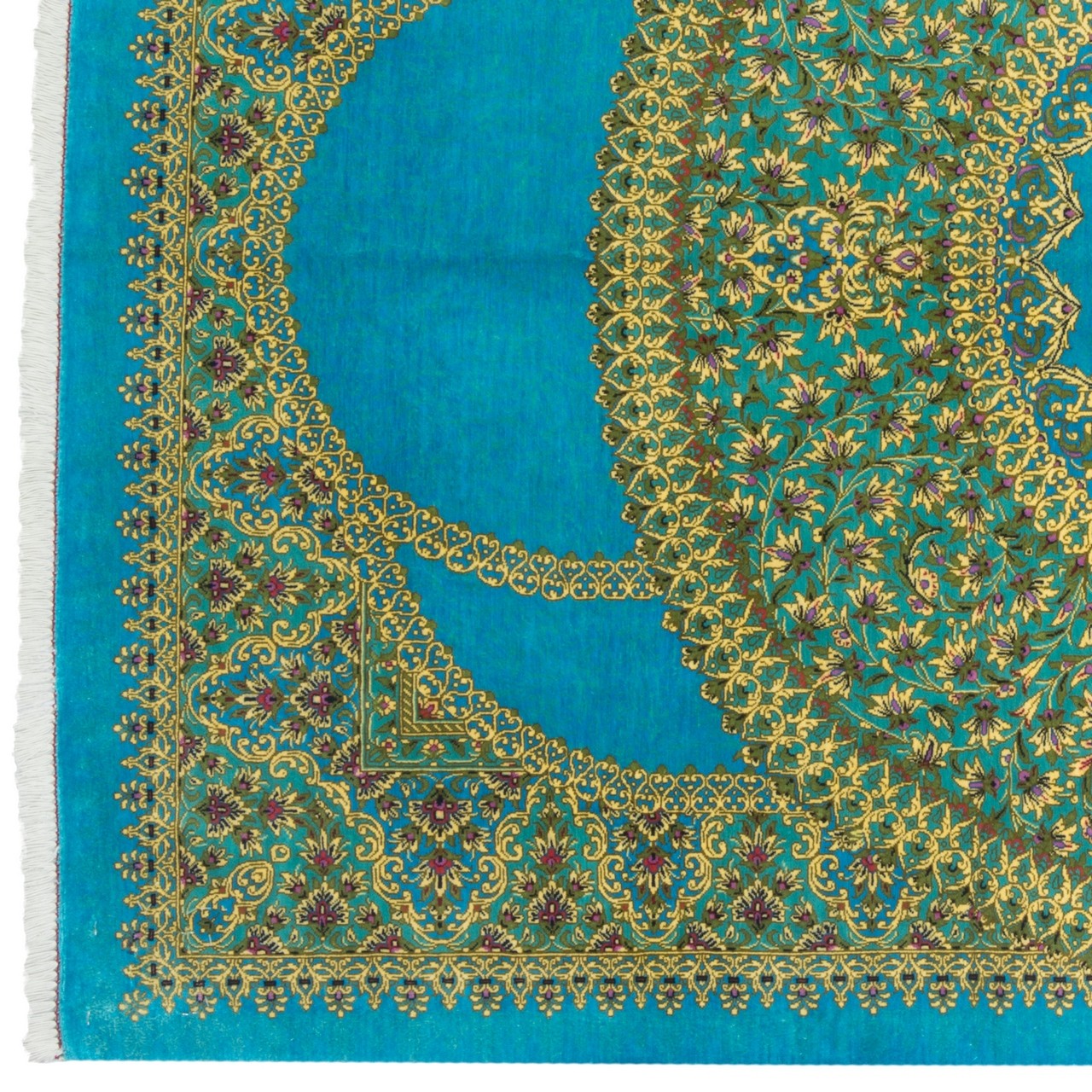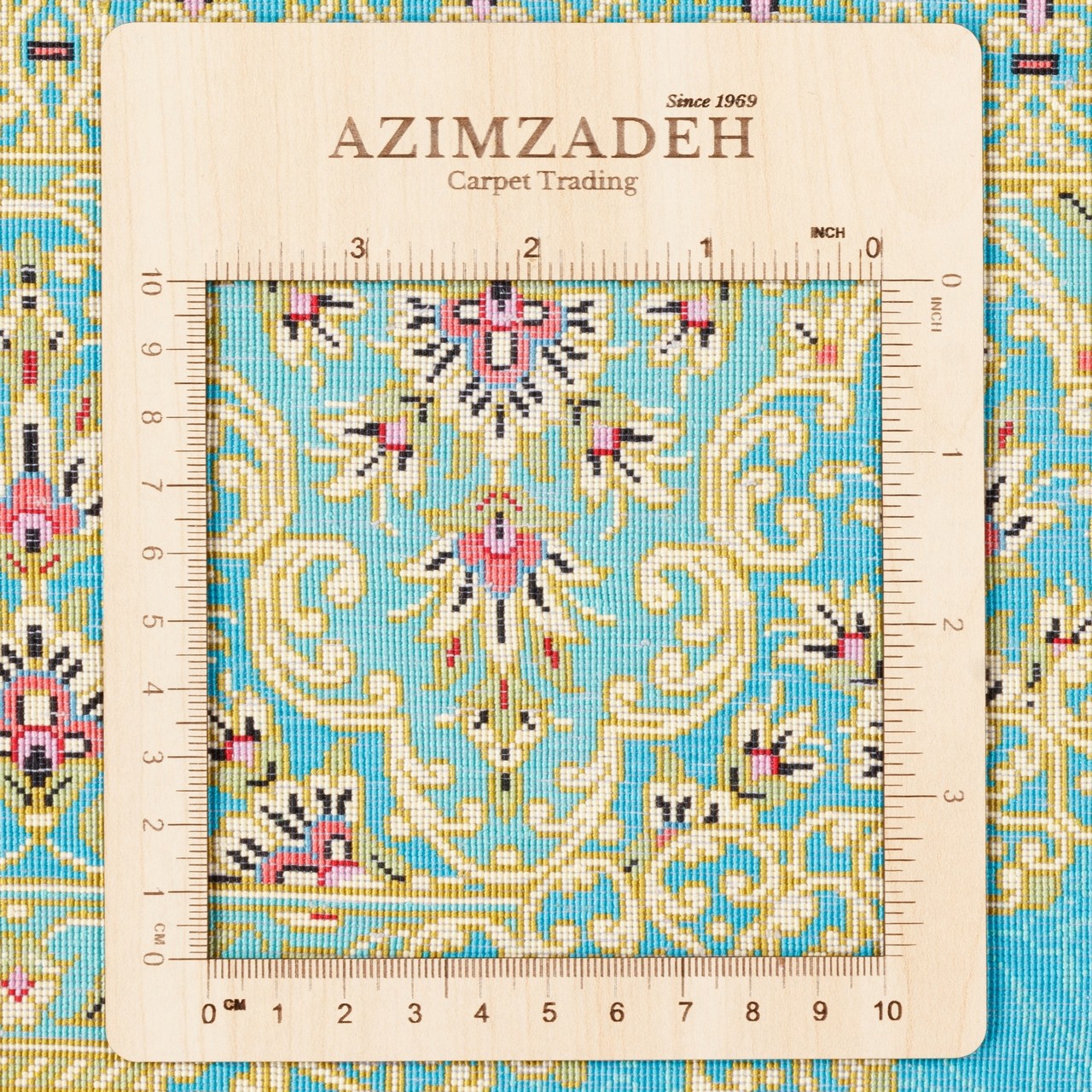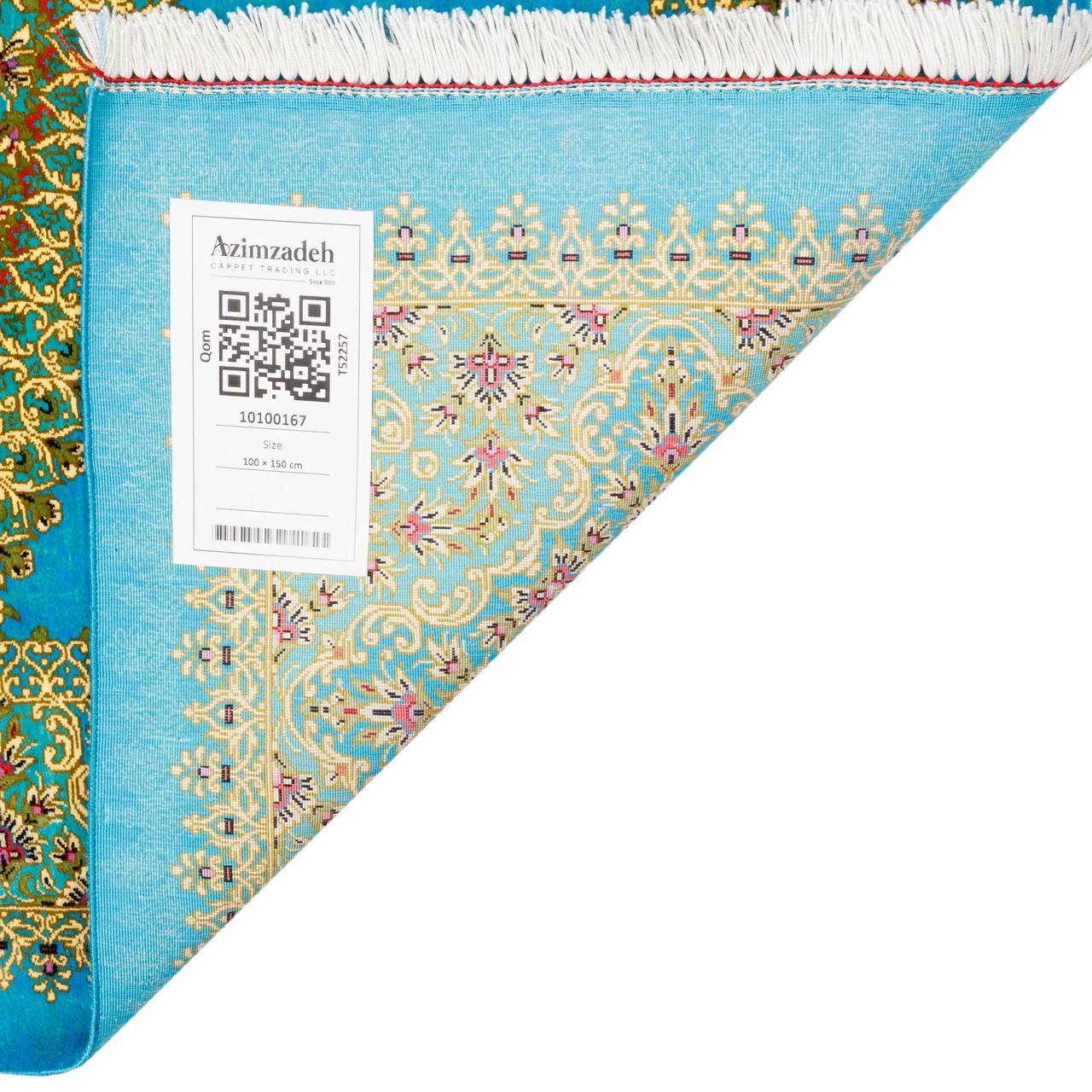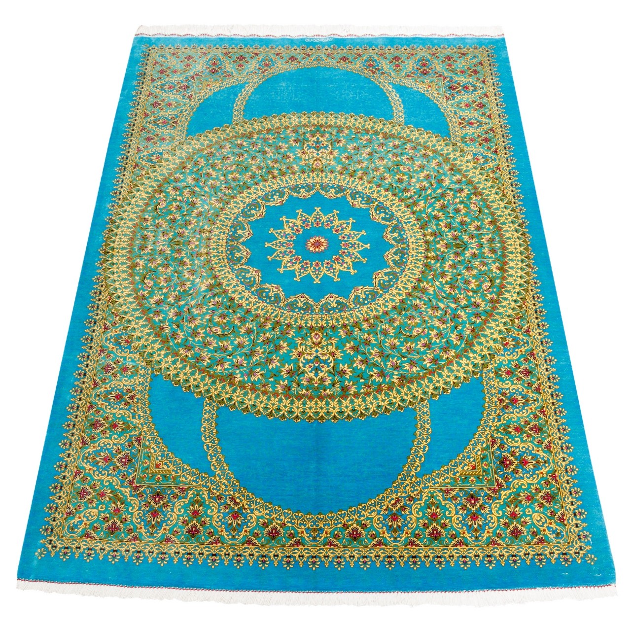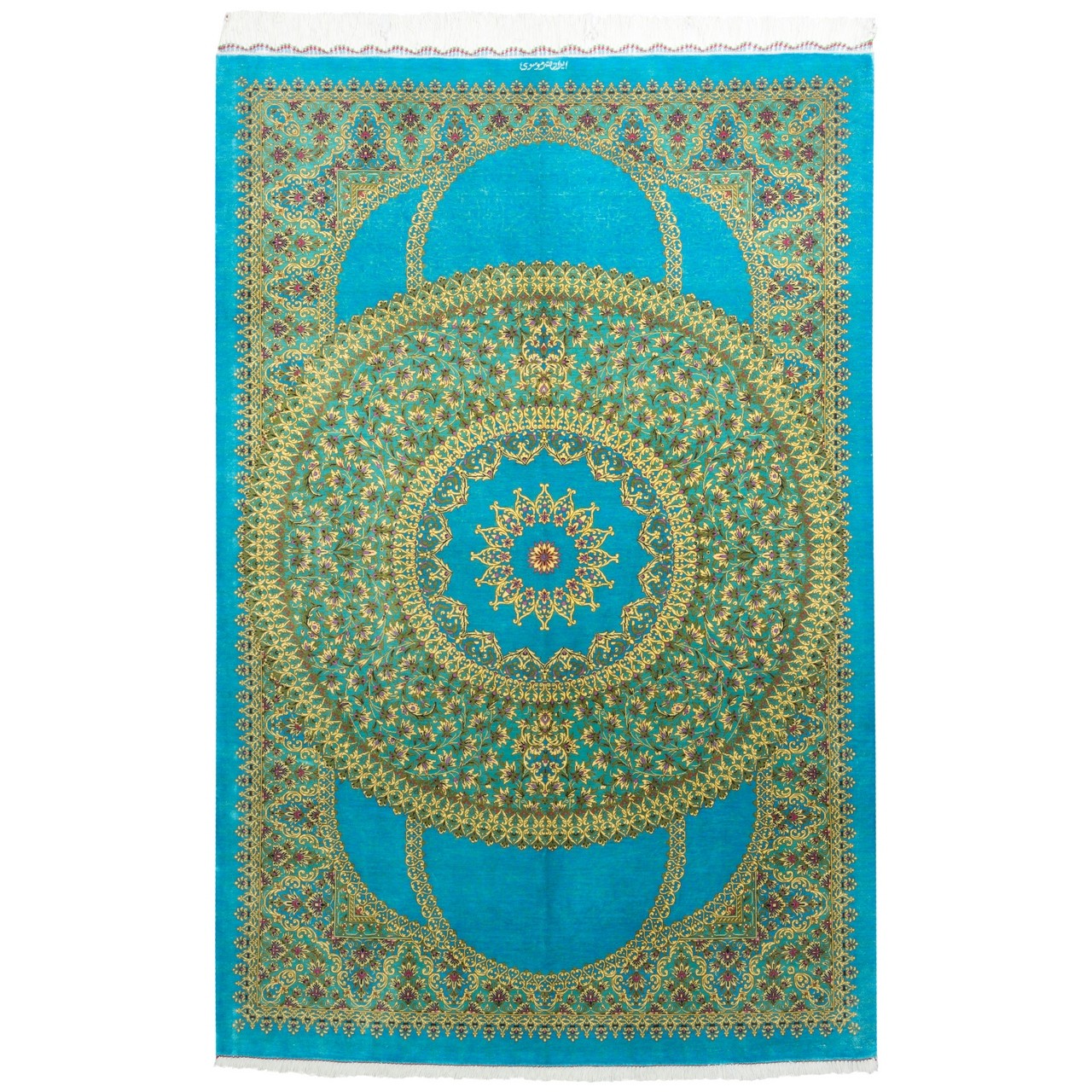 این فرش دستباف تمام ابریشم قم، با ابعاد ۱۰۰ × ۱۵۰ سانتی‌متر و مساحت ۱.۵ مترمربع، نماینده‌ای شکوهمند از هنر قالیبافی ایرانی‌ است که در قالبی نوین، به کمال رسیده است. این فرش با برند فرش «موسوی» و طرح اصیل ترنج‌دار که ریشه در نقوش کهن ایرانی دارد، با چیدمانی گل‌دار و درخشان و نگاهی لطیف و شاعرانه بازآفرینی شده است. رجشمار ۷۰ این اثر، بیانگر ظرافت و مهارت در بافت است؛ نشانه‌ای از آن‌که این فرش نه تنها از نظر زیبایی بصری، بلکه از منظر فنی نیز در بالاترین سطح قرار دارد. زمینه‌ی فیروزه‌ای آرام و درخشان، همچون آسمانی بهاری بر بستری از ابریشم می‌درخشد و با حاشیه‌ای هم‌رنگ، نوعی یگانگی و هماهنگی چشم‌نواز پدید آورده است؛ ترکیبی که در عین طراوت، وقار و آرامشی هنری را به فضا می‌بخشد. جنس تمام ابریشم فرش، بافتی لطیف، درخشان و انعطاف‌پذیر به آن بخشیده که نور را به‌زیبایی در هر زاویه‌ای بازتاب می‌دهد. این فرش قم، میراثی است از هنر و اصالت، گویی تکه‌ای از آسمان فیروزه‌ای ایران بر زمین نشسته است.