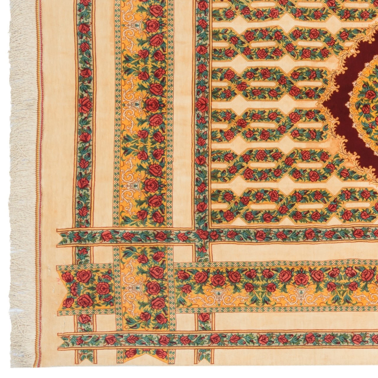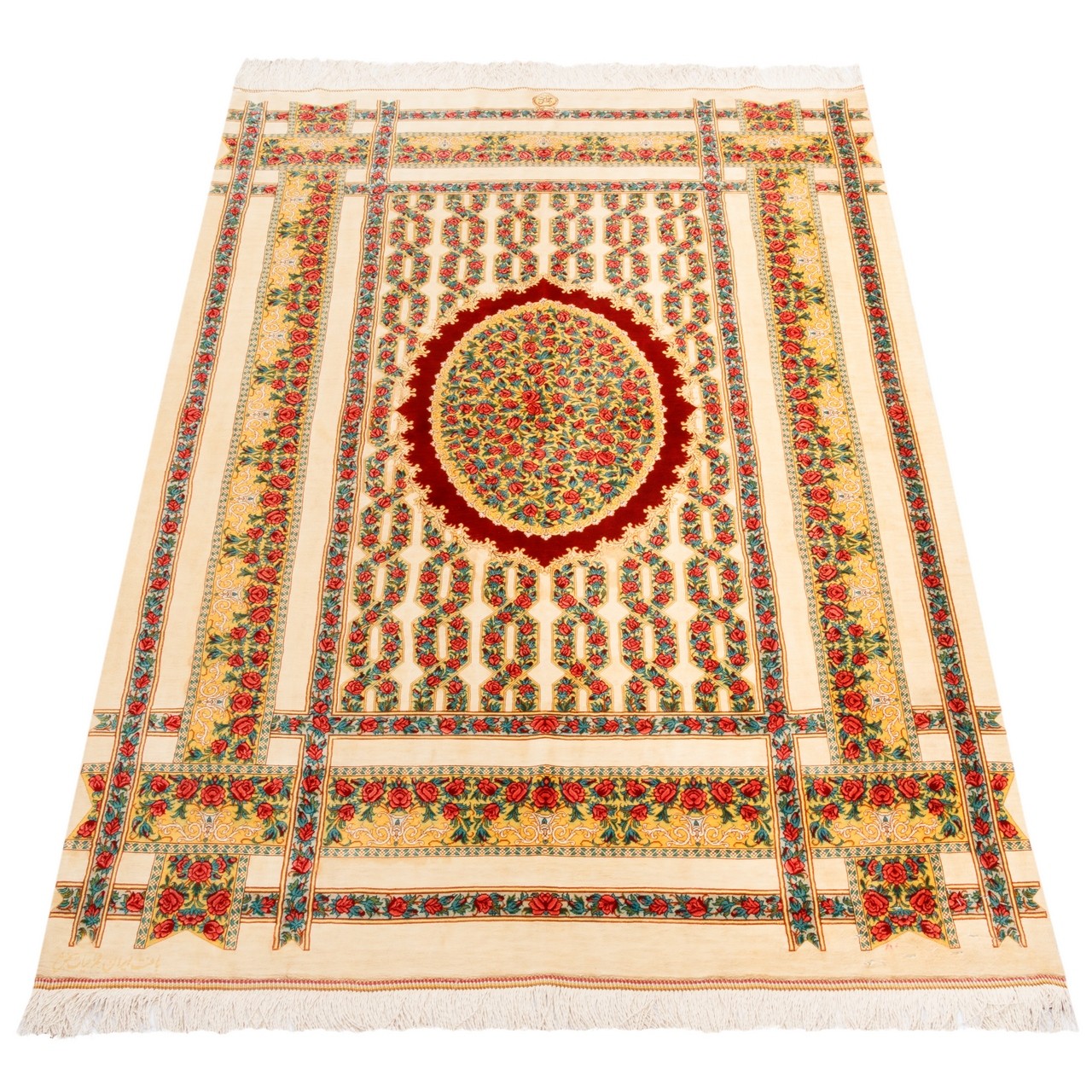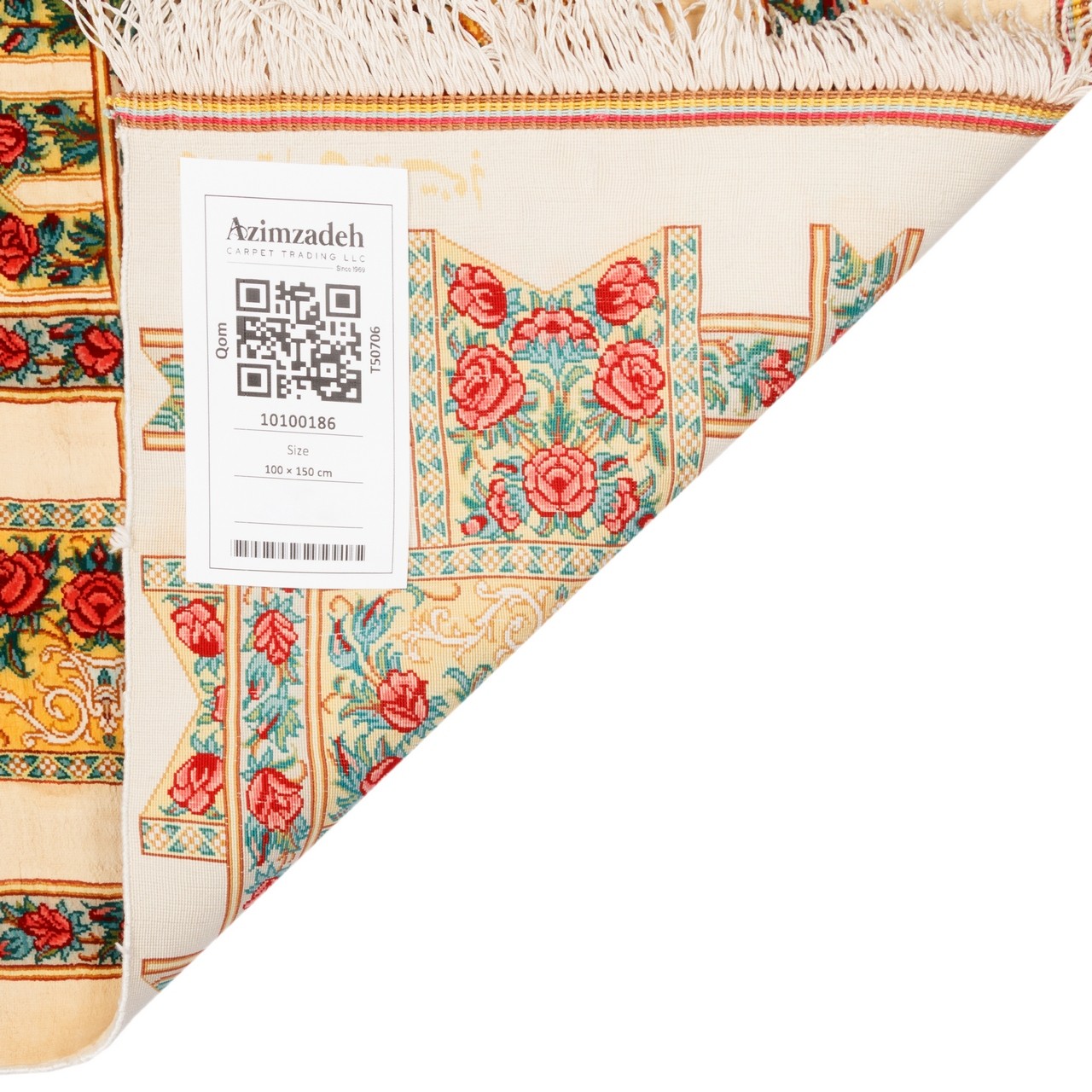 این فرش تمام ابریشم قم، با ابعاد ۱۰۰ × ۱۵۰ سانتی‌متر و مساحت ۱.۵ متر مربع، حاصل تلفیق هنر قالیبافی با نگاهی لطیف و شاعرانه به زیبایی‌ست. فرش با برند «حیات‌بخش» با رجشمار 70 بافته شده است. طرح ترنج‌دار در این بافته، در مرکز قالی، با گل‌بوته‌هایی ظریف و منظم احاطه شده است. ترنج، با شکلی موزون و با رنگ‌هایی دلنشین، در زمینه‌ای کرم‌رنگ آرام گرفته و نقوش گلدار اطرافش، به‌ویژه گل‌های رز با رنگ‌آمیزی ماهرانه‌شان، حسی از لطافت و طراوت به اثر می‌بخشند. حاشیه‌ی نخودی، همچون قابی لطیف، انسجامی دلنشین به ترکیب کلی فرش می‌دهد و آن را به اثری کامل و هماهنگ بدل کرده است. این فرش تمام ابریشم، نمودی از هنر، طبیعت و ظرافت است.