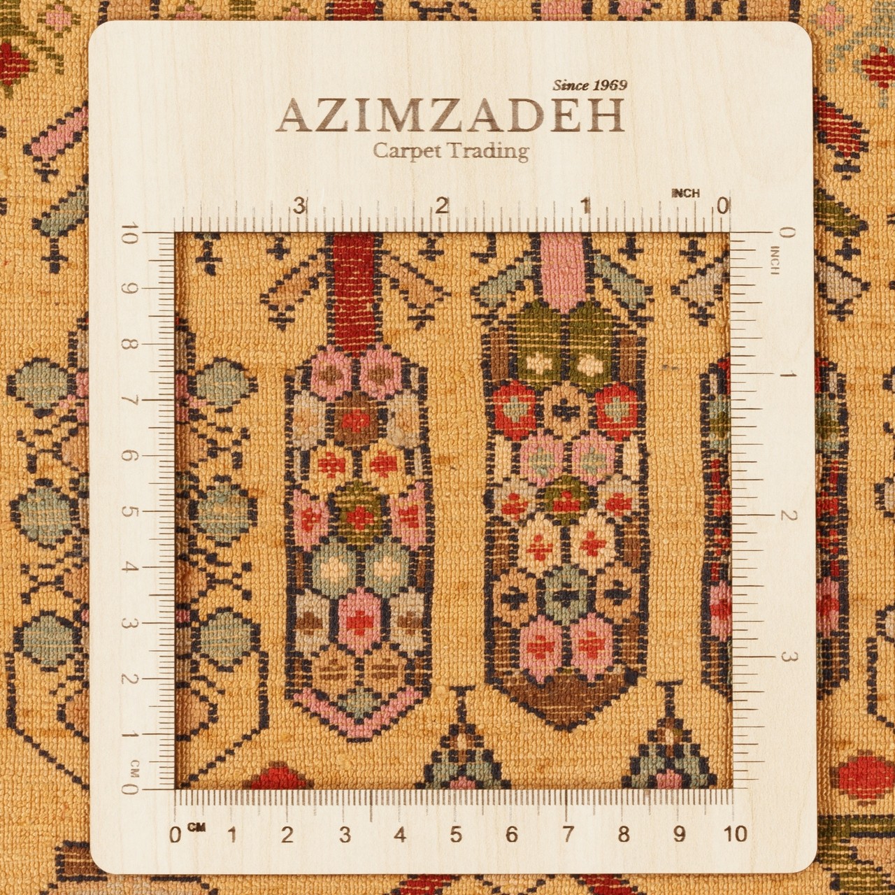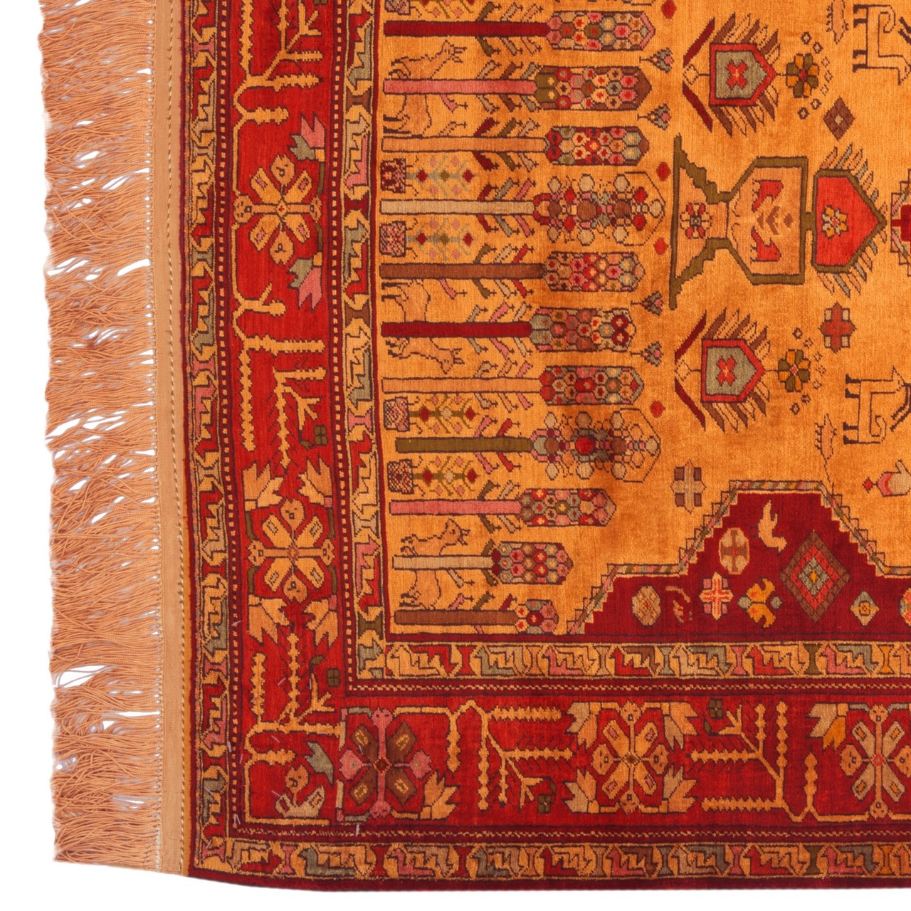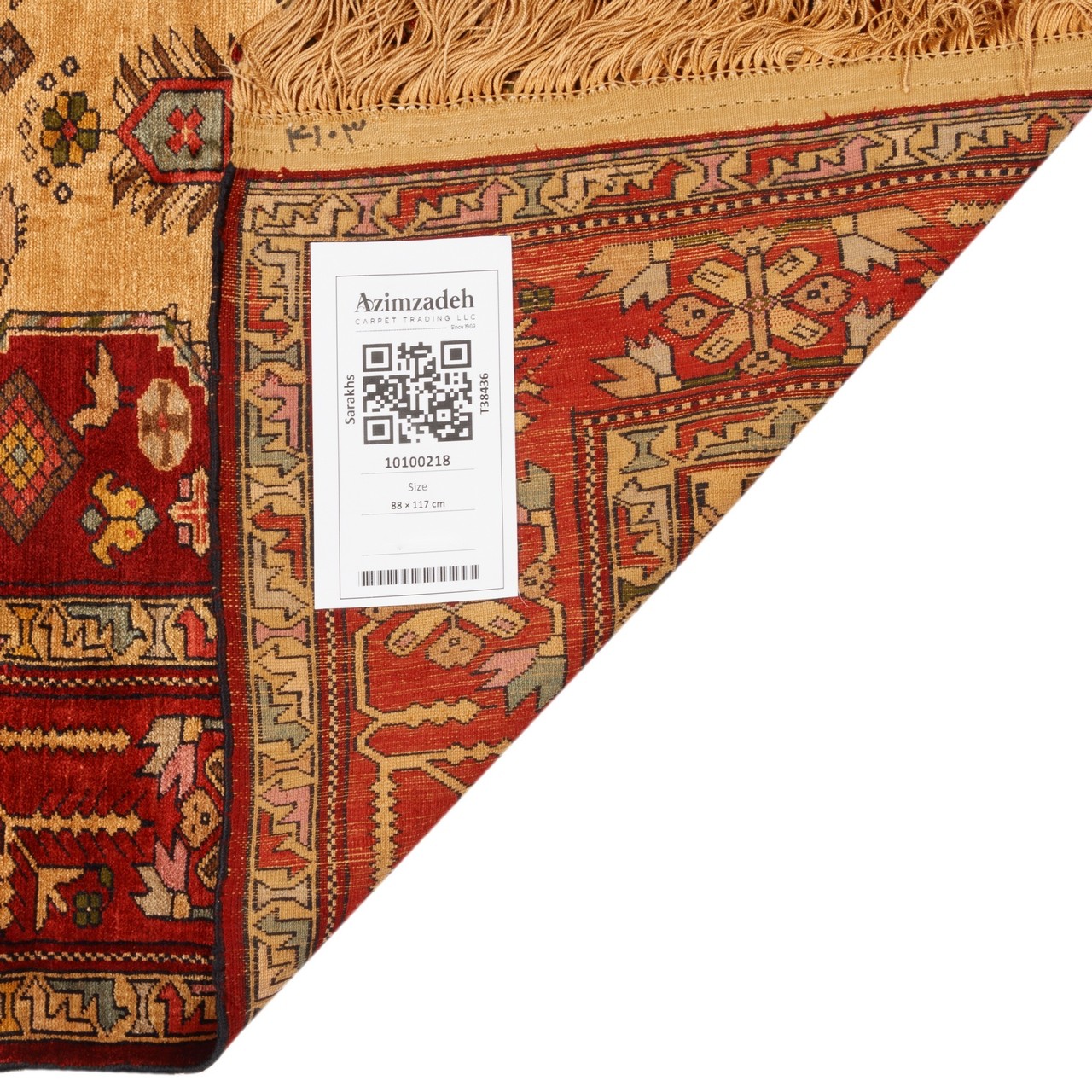 فرش دستبافت سرخس، منطقه‌ای که کمتر با فرش‌های تمام‌ابریشم شناخته شده، اما با این فرش نام خود را در کنار مراکز فاخر فرشبافی ابریشم ایران قرار می‌دهد. فرشی به ابعاد ۸۸ × ۱۱۷ سانتی‌متر و مساحت ۱.۰۳ مترمربع، که نه‌تنها نمایانگر دقت و ظرافتی بی‌بدیل است، بلکه در ریزباف‌ترین دسته‌بندی‌ها نیز جای می‌گیرد، چرا که با رجشمار بسیار بالا، بافته شده است. این فرش، با طرح ترنج‌دار و نقش‌های هندسی، آمیزه‌ای‌ست از هندسه و هنر، جایی که خطوط منظم و حساب‌شده، با لطافت ابریشم و رنگ‌های هوشمندانه درهم آمیخته‌اند. ترنج مرکزی، در میان زمینه‌ای طلایی، همچون خورشیدی درخشان می‌درخشد؛ رنگی که با درخشش طبیعی ابریشم، بازتابی نورگونه به خود می‌گیرد و در ترکیب با حاشیه لاکی، تضادی باشکوه و فریبنده می‌آفریند. نقوش حیوانی و درختی نیز در زمینه‌ی فرش حضور دارند. جنس تمام ابریشم این فرش، ضمن ایجاد لطافتی بی‌نظیر، باعث می‌شود تا ریزترین جزئیات نقوش هندسی با دقت و شفافیتی خیره‌کننده دیده شوند.