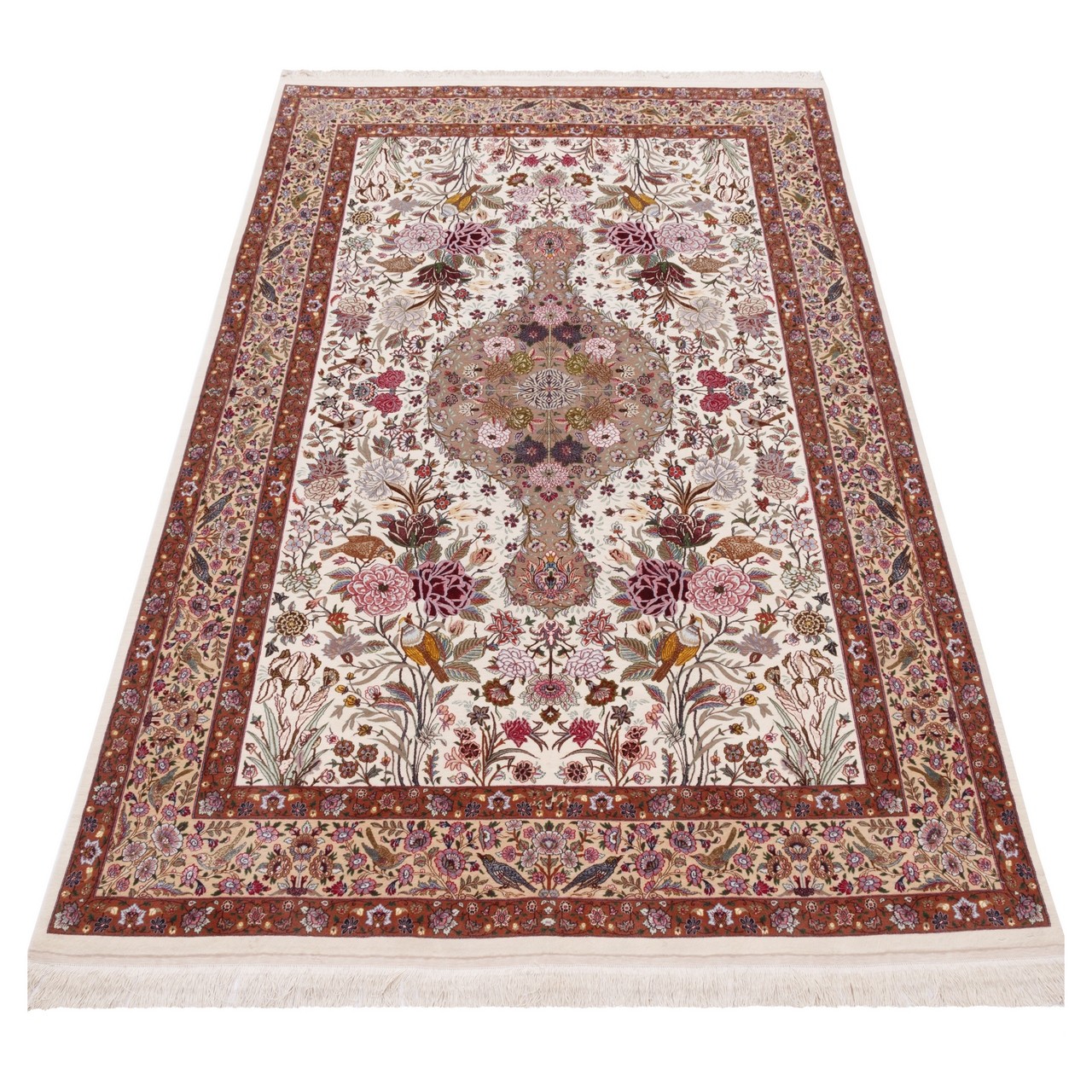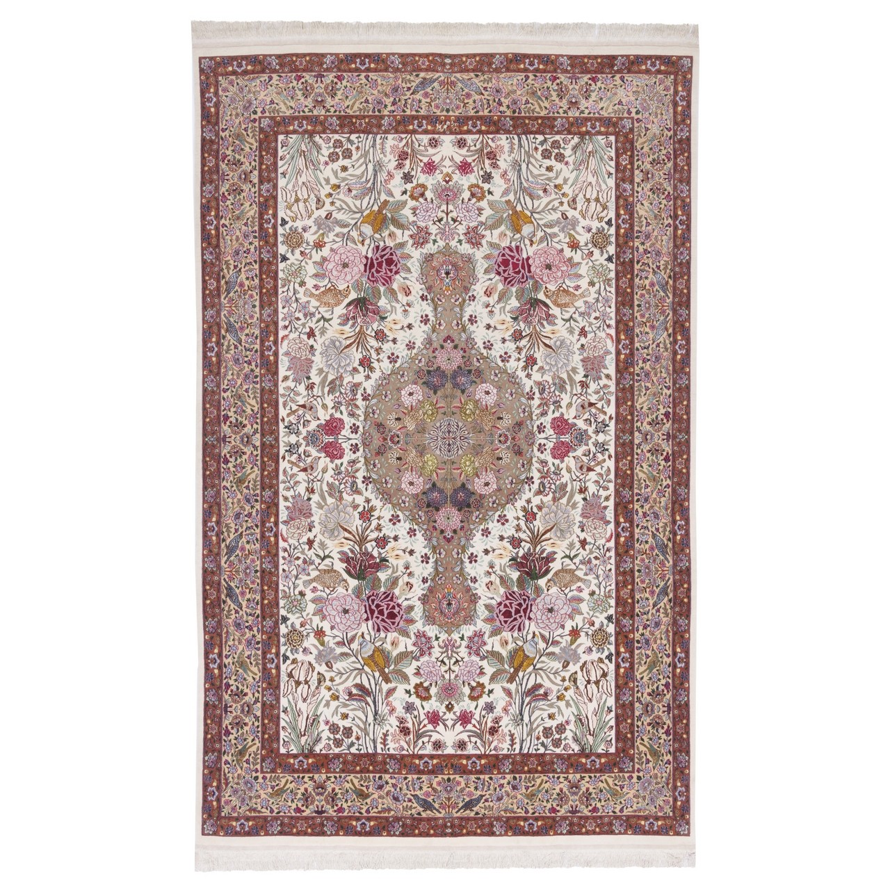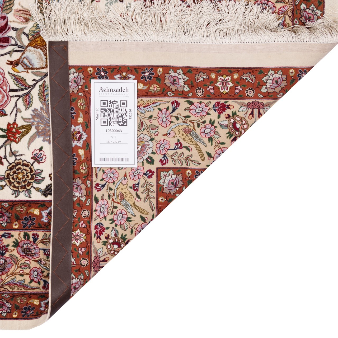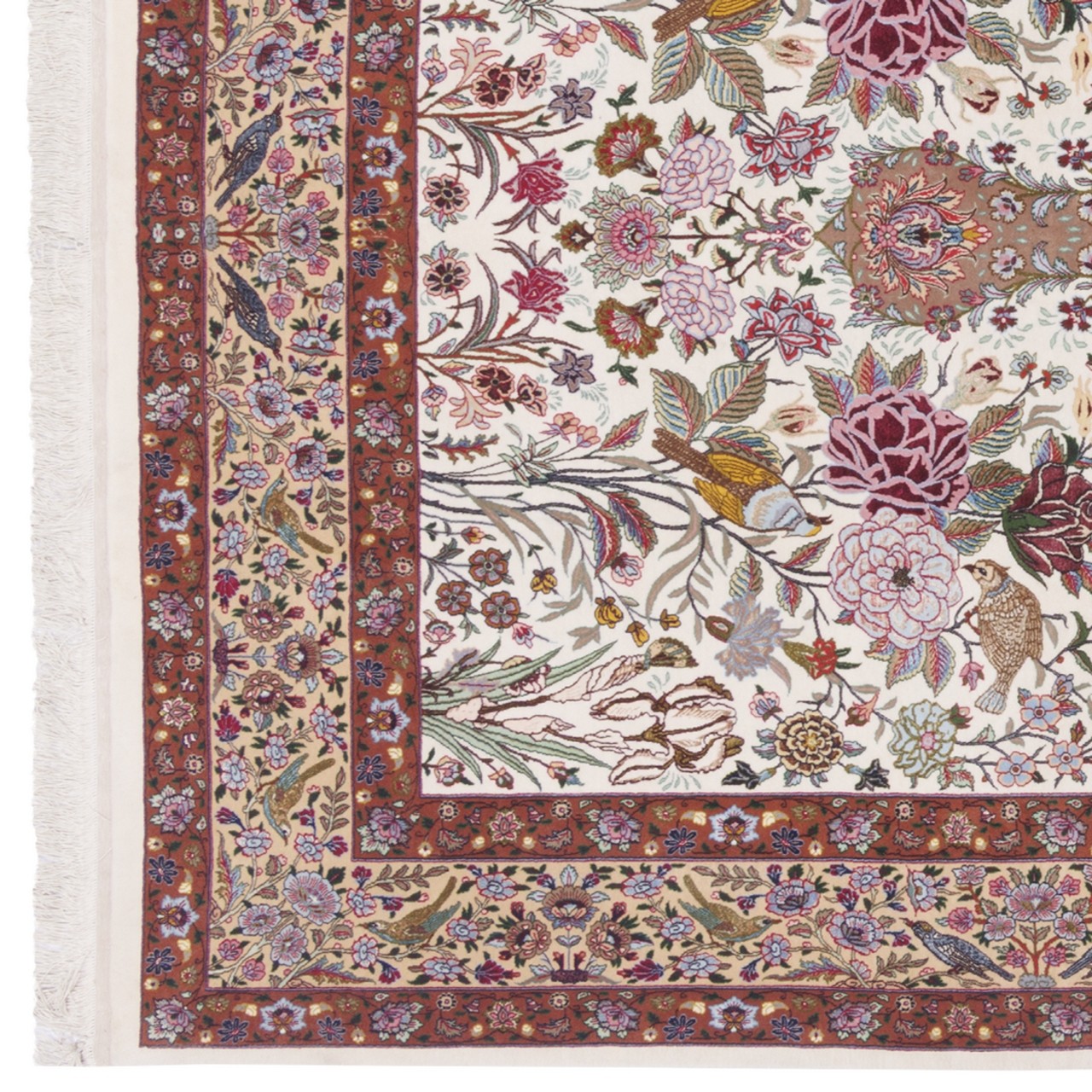 این فرش دستبافت ترنج دار گل ابریشم با ابعاد ۱۵۷ × ۲۵۰ سانتیمتر و مساحت ۳.۹۳ متر مربع، دارای برند «باقر گل پرور»، نمونهای شاخص از هنر قالیبافی مشهد است که هم در فرم و هم در مفهوم، زبان گویای فرهنگ دیرپای ایرانزمین محسوب میشود. رجشمار ۹۰ در این فرش، نشانیست از ظرافتی شگرف و دقتی مینیاتوری؛ چنانکه هر گره، حاصل مراقبهای هنرمندانه است. استفاده از ابریشم در متن و چلهی ابریشم خالص، سبب شده که این اثر نهتنها از لطافتی منحصربهفرد برخوردار باشد، بلکه درخشش ظریف ابریشم، به رنگها جانی دوچندان بخشیده است. نقش ترنج در مرکز زمینهای کرمرنگ با حاشیه نخودی، همچون خورشیدی درخشان در میانهی یک باغ خیالانگیز میدرخشد. نقش گل و مرغ که در دل این فرش جای گرفته، نشانگر گفتوگوی خاموش میان گل که معشوق است و مرغ که دلباخته است و بازتابی از مفاهیم عرفانی و عشق ناب در ادبیات و نگارگری ایرانیست. ترکیب این نقش با طرح ترنجدار، جلوهای متوازن و باشکوه پدید آورده است. نقوش گل و مرغ در ابتدا در کتابآرایی، نگارگری، و لاکیسازی رایج بودند. هنرمندان قاجاری، این موتیفها را از هنر تصویری به فرش منتقل کردند.