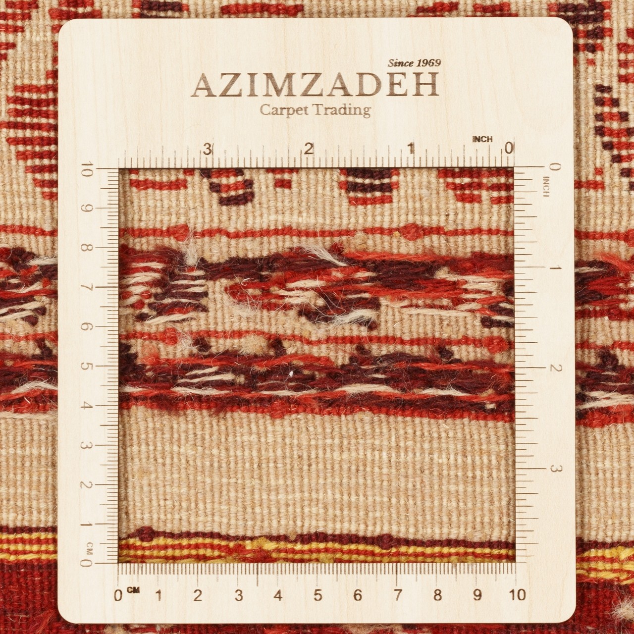 این گلیم فرش دستبافت در اندازه ۱۰۰ × ۱۵۲ سانتی‌متر و با مساحت ۱.۵۲ متر مربع بافته شده است. گلیم فرش سیرجانی با طرح خشتی و نقوش هندسی، نمایانگر تداوم یک سنت کهن و ارزشمند در بخش کویری جنوب ایران است. با رجشمار ۳۵، این گلیم به‌ دست بافندگان هنرمند سیرجان، با دقت و ظرافتی آمیخته به ذوق و تجربه، از پشم مرغوب گوسفند بافته شده و به‌خوبی گویای اصالت، دوام و هویت فرهنگی آن منطقه است. طرح خشتی، در این گلیم با نگاهی هندسی پیاده شده است. هر خشت همچون قطعه‌ای منظم از معماری سنتی، با ترکیب هندسه و خلاقیت، در قالب طرحی منسجم و متوازن جای گرفته و تصویری از نظم و زیبایی سنتی ایرانی را به نمایش می‌گذارد. رنگ نخودی که هم در زمینه و هم در حاشیه فرش غالب است، با لطافت و گرمایی ملایم، فضایی آرام و هماهنگ را خلق کرده است؛ انتخابی هوشمندانه که در کنار طراحی کلاسیک خشتی، این گلیم را به گزینه‌ای ممتاز برای فضاهای مدرن با روحیه‌ای سنت‌گرا تبدیل می‌سازد. گلیم‌های دستباف سیرجان نه‌تنها حاصل بافندگی، بلکه روایتگر تاریخ، فرهنگ و سبک زندگی‌اند.
