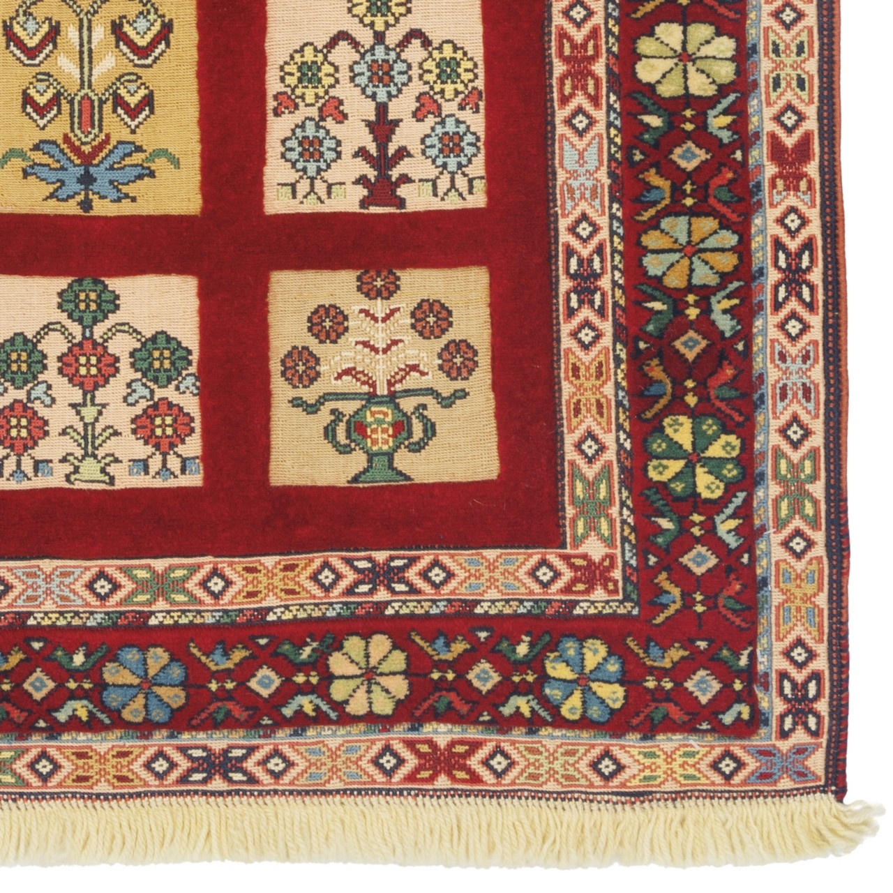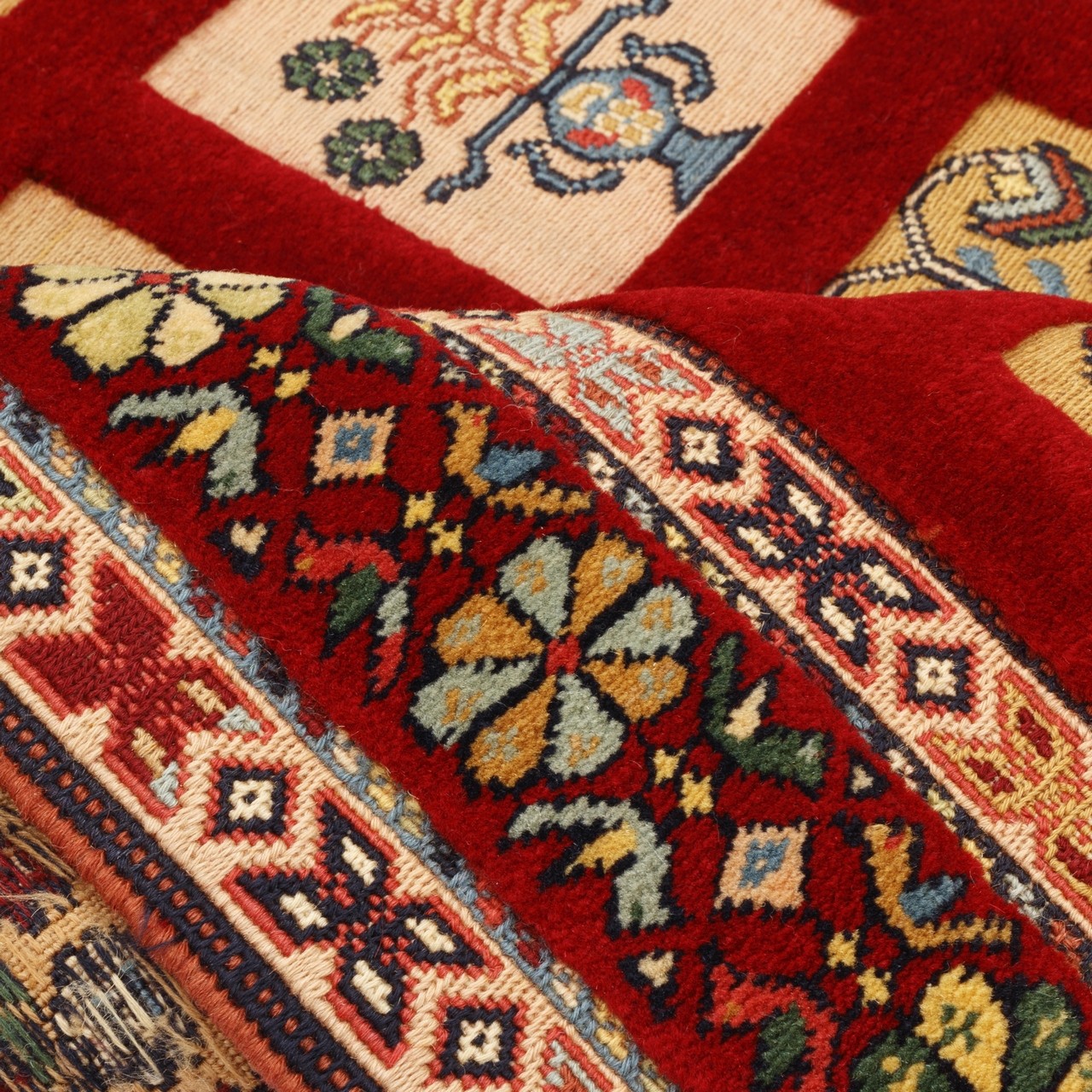 این گلیم فرش دستباف سیرجان با ابعاد 82 × 127 سانتی‌متر و مساحت 1.05 مترمربع با طرح خشتی بافته شده است. رجشمار این گلیم 35 است و به‌صورت تمام‌پشم تولید شده است. طرح خشتی این گلیم ساختاری منظم و در عین حال سرشار از معنا دارد، که در آن هر خشت، جهانی کوچک از نقش‌های سنتی‌ را در خود جای داده است. رنگ لاکی در زمینه و حاشیه، با شکوهی پرحرارت و غنای رنگی منحصربه‌فرد، حسی درخشان به گلیم می‌بخشد؛ رنگی که ریشه در فرهنگ بصری ایران دارد و حس قدرت، گرما و اصالت را به‌خوبی منتقل می‌کند. این گلیم فرش یک دستبافته‌ی زیبا مناسب برای دکوراسیون‌های سنتی و مدرن است.