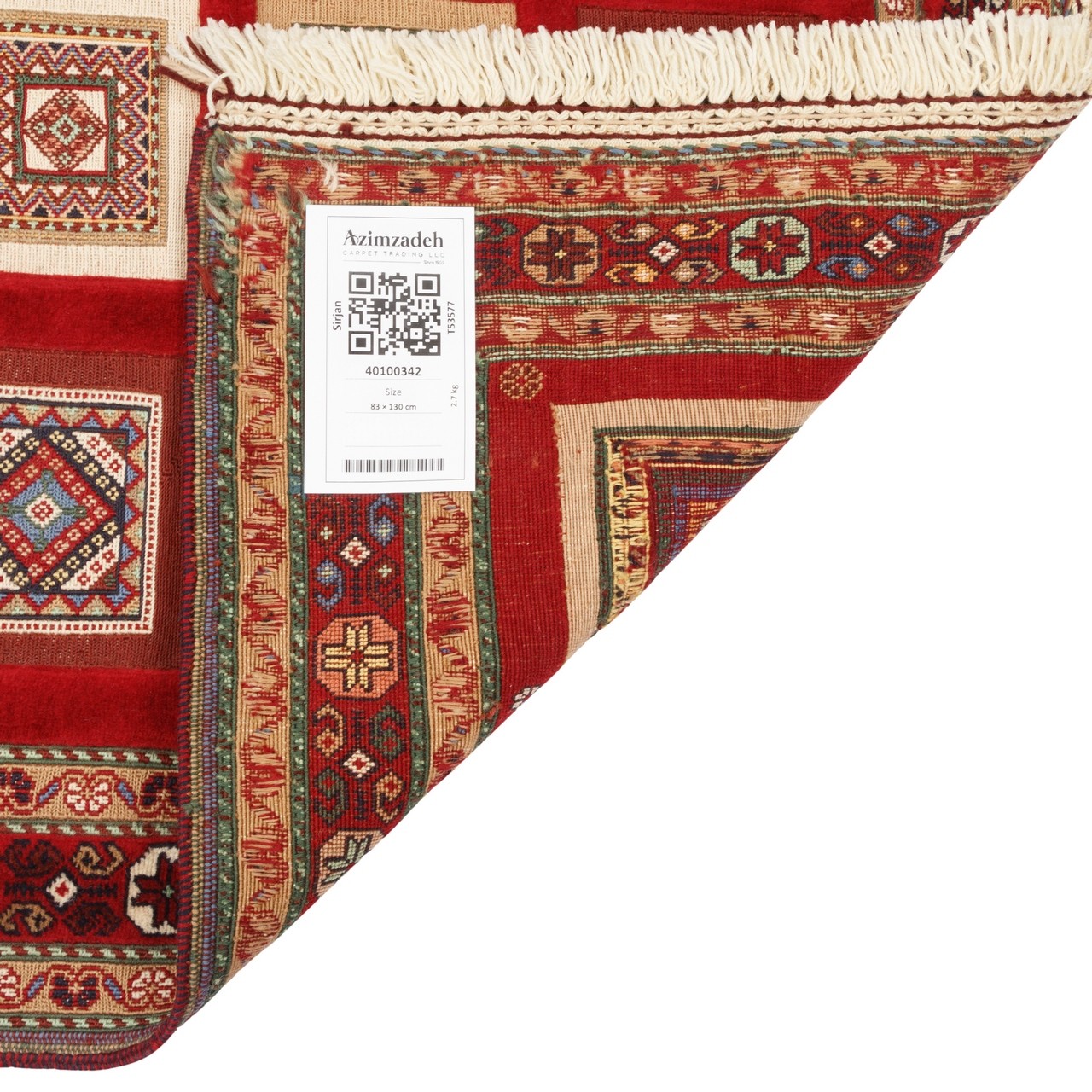 گلیم‌ فرش دستبافت سیرجان با ابعاد 130 × 83 سانتی‌متر و مساحتی برابر با 1.08 متر مربع با طرح خشتی بافته شده است. نمونه‌ای از گلیم‌ فرش‌های تمام‌پشمی منطقه است، که با رجشمار 35 تولید شده. طرح خشتی به‌کاررفته در این گلیم ‌فرش با آرایش موزون از قاب‌های منظم، بیانگر نظم ذهن ایرانی و علاقه‌اش به تقارن و تعادل در طراحی است. رنگ لاکی، که هم در زمینه و هم در حاشیه تکرار شده، گرمایی عمیق و اصالتی بی‌پایان به این بافته بخشیده و آن را به گزینه‌ای بی‌بدیل برای فضاهای گرم و صمیمی بدل کرده است. این گلیم‌ فرش، اثری است که می‌تواند به‌ عنوان یک عنصر تزئینی اصیل در دکوراسیون داخلی بدرخشد.
