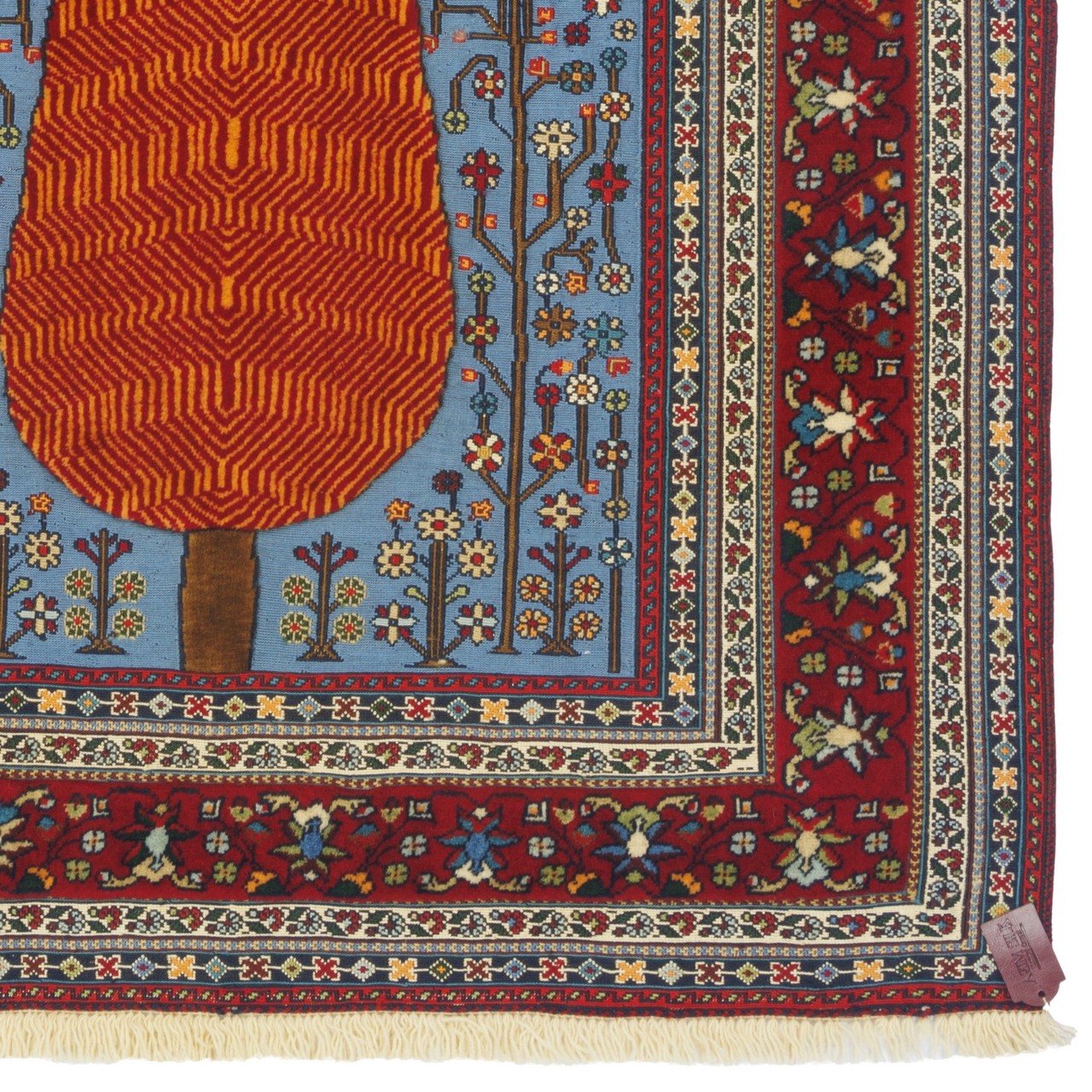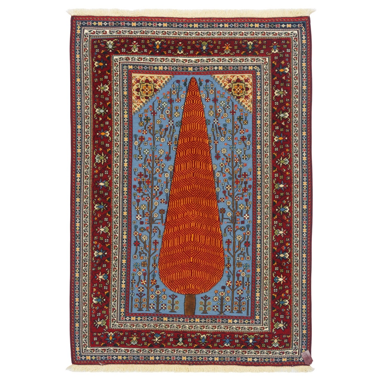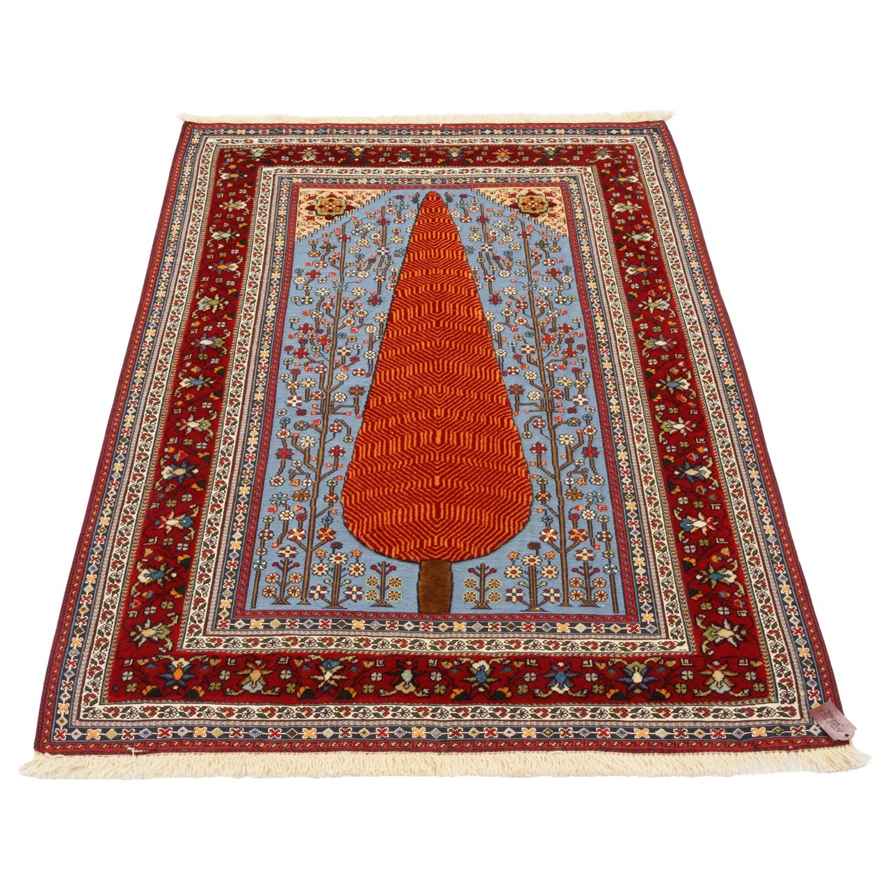 گلیم فرش دستباف سیرجان، با اندازه 106 × 152 سانتی‌متر و مساحتی معادل 1.62 متر مربع با طرح درختی بافته شده که با دقت و مهارت در رجشمار 35 تولید شده است. این گلیم تماماً از پشم بافته شده، در زمینه‌ای به رنگ آبی ملایم و طرح درختی؛ درخت سرو که نماد آزادگی‌ست و ریشه در باورها و فرهنگ ایران دارد. این نقش، برخلاف ساختارهای هندسی رایج، روحی شاعرانه دارد و با الهام از باغ‌های ایرانی، پیام‌آور امید، تداوم و آرامش است. حاشیه‌ی لاکی رنگ با ظرافتی خاص، همچون قابی گرم و محافظ، پیرامون درخت را احاطه کرده و کنتراستی هنرمندانه با زمینه آبی پدید آورده است. این انتخاب رنگ، جلوه‌ای از هنر رنگ‌شناسی بافندگان سیرجانی‌ است که در هر گره، زیبایی‌شناسی را با فلسفه‌ی زیستن پیوند داده‌اند.