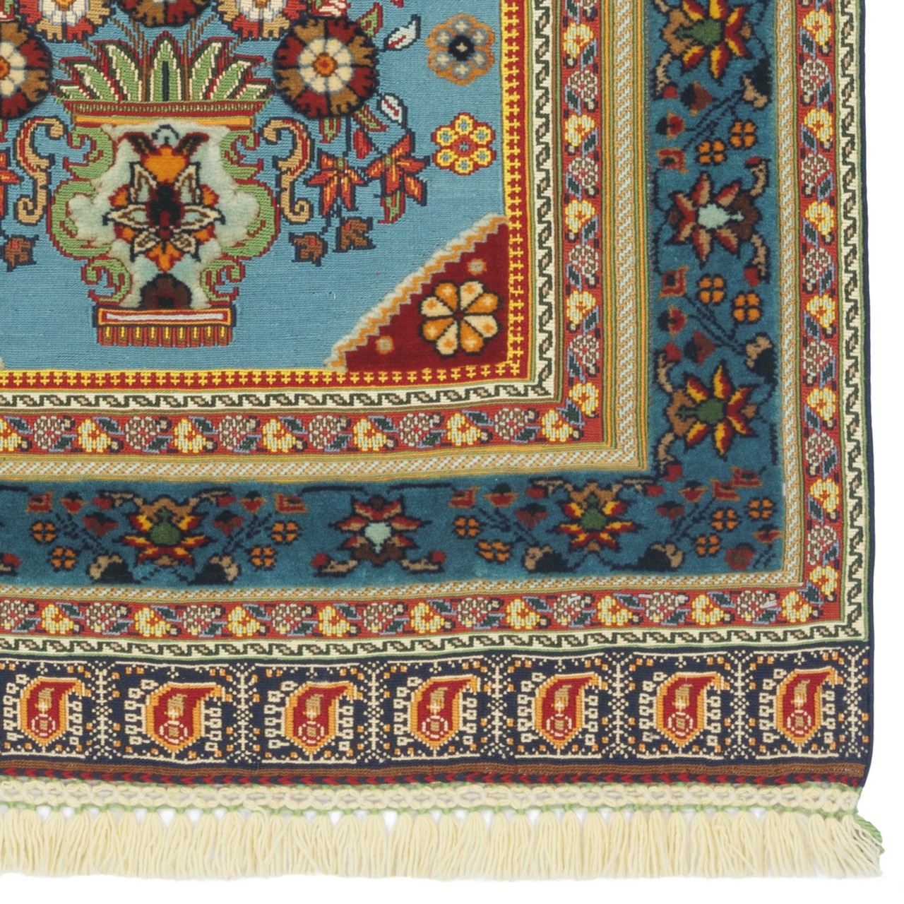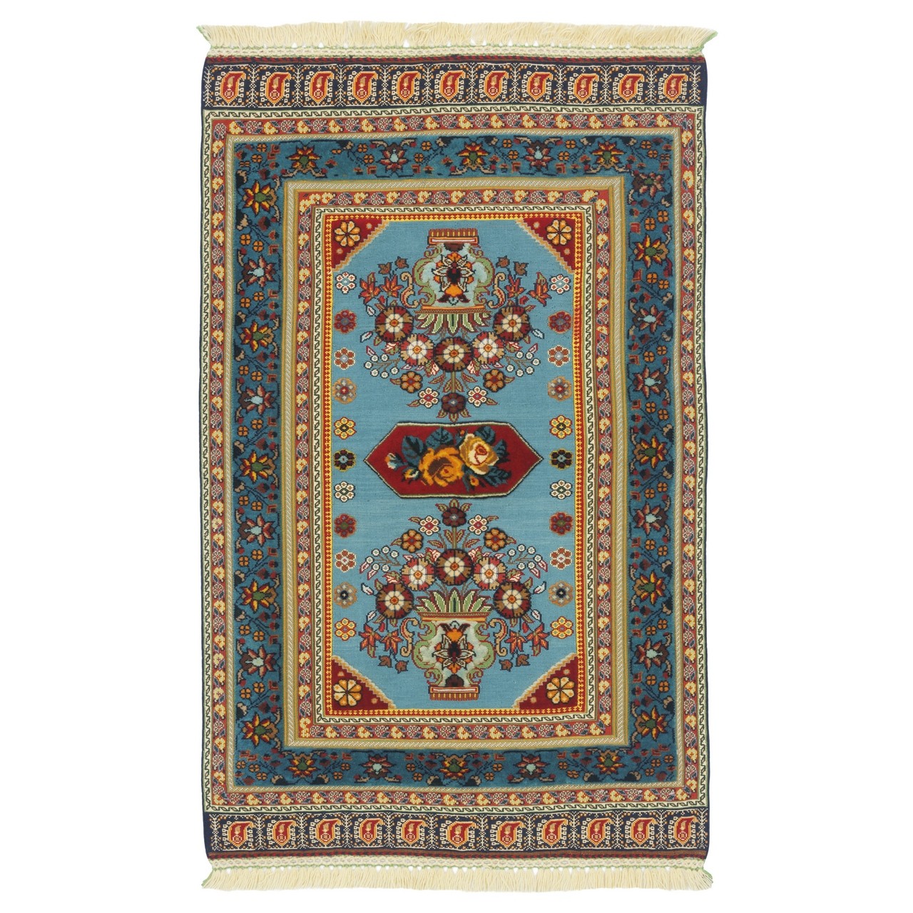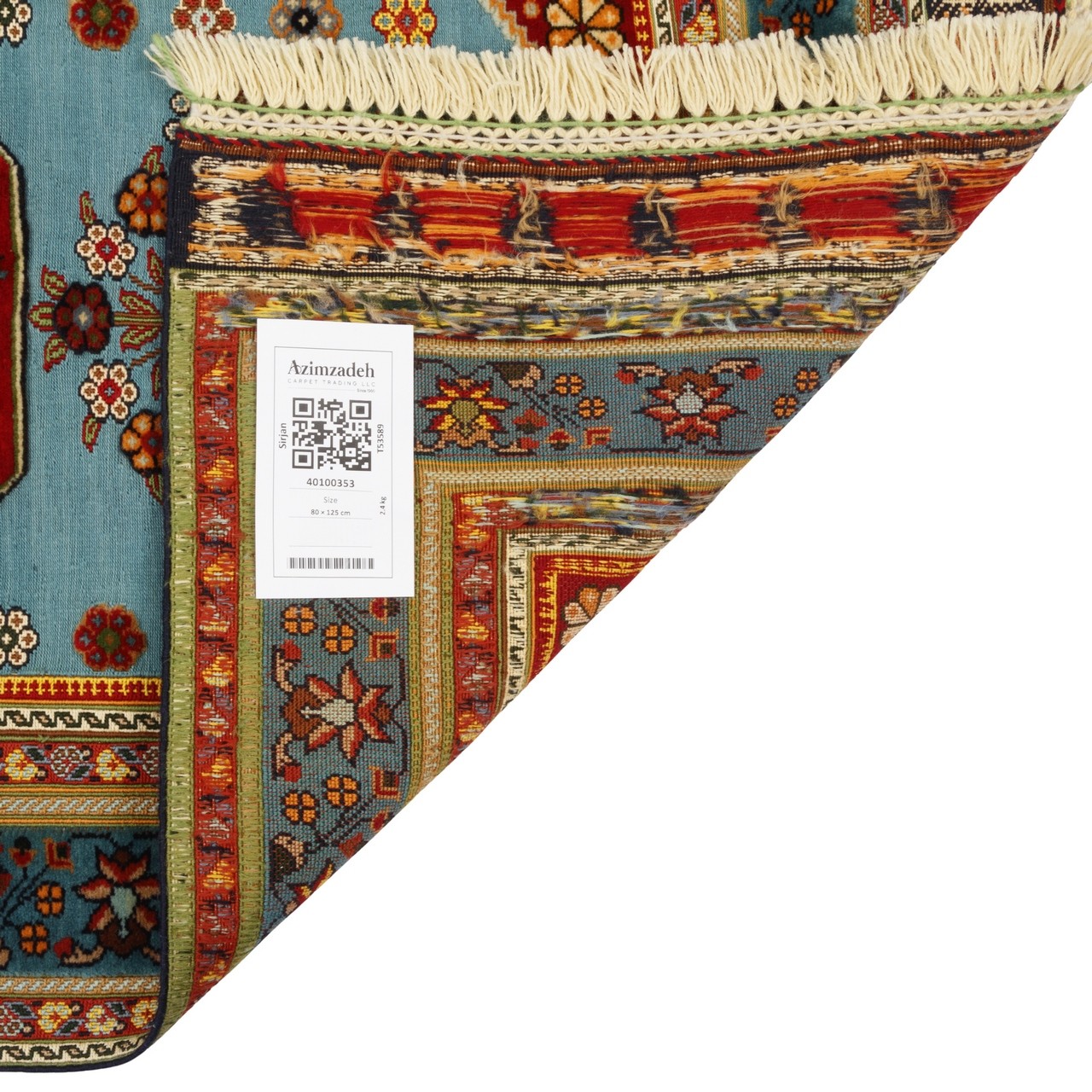 این گلیم ‌فرش دستباف سیرجان، با ابعاد 80 × 125 سانتی‌متر و مساحت دقیق 1 مترمربع با طرح گلدانی بافته شده است. رجشمار این گلیم 35 است، که به‌صورت تمام‌پشم تولید شده است. نقش‌های گل‌دار که درون گلدان‌هایی نقش بسته‌اند، همچون شاخه‌های رقصان در نسیم، احساس آرامش و طراوت را برمی‌انگیزند. زمینه‌ی آبیِ فرش، چون آسمانی آرام، بستر مناسبی برای نقش‌های گل‌دار فراهم کرده و حاشیه‌ای همرنگ، انسجام و هارمونی کلی را حفظ نموده است. استفاده از پشم طبیعی، علاوه بر نرمی و لطافت، نوعی پیوند با طبیعت و زیست‌بوم روستایی را تداعی می‌کند که گلیم‌های سیرجان همواره بدان وفادار مانده‌اند.