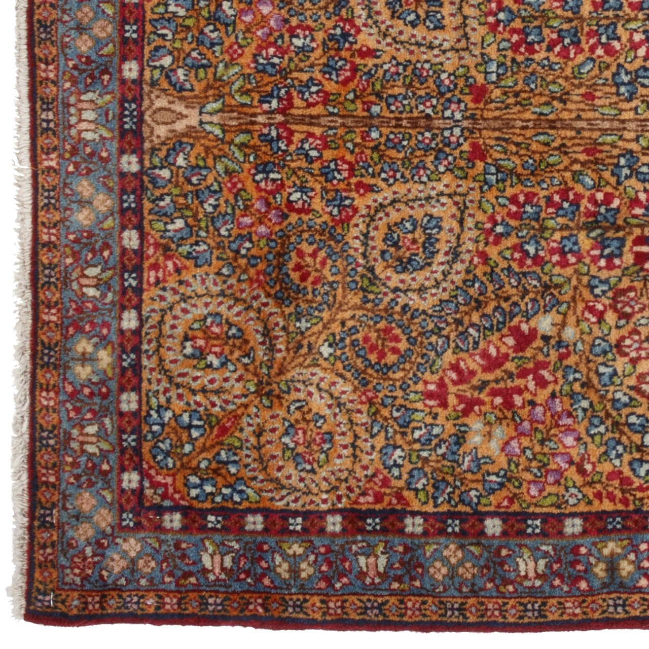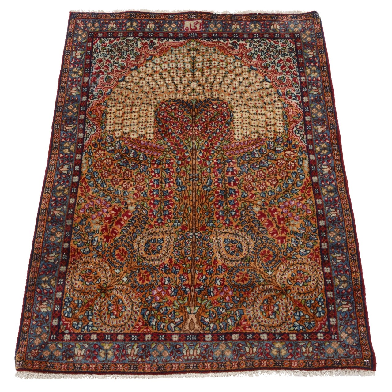 فرشی دستباف کرمان با نقش سراسر گلدار توسط برند «آگاه» خلق شده و همچون باغی جاودانه بر بستر پشم تنیده شده است. نقش گلدار در فرش کرمان، یکی از ویژگیهای شاخص و شناسههای اصلی قالی این منطقه است. فرشهای کرمان از دیرباز به استفاده از نقوش گیاهی و گلهای متنوع، پرشکوفه، و پُر شهرت داشتهاند و این طرحها، هم در قالیهای بزرگپارچهی درباری و هم در بافتههای مردمی و صادراتی، حضوری پررنگ داشتهاند این فرش کوچک اما پرجلوه، با اندازهی ۶۰ × ۸۵ سانتیمتر و با مساحت 0.51 متر مربع، تجسمی از هنر اصیل و نگاه دقیق طراح است؛ کسی که هر گل و بوته را نه صرفاً به قصد تزئین، بلکه به مثابه بیان احساس و روایت زمان، در این اثر نشانده است. رجشمار ۵۰، آن را در مرز ظرافت و دقت قرار میدهد؛ گرههایی منظم و پیوسته که همچون آوای تار در دست استاد، به خلق تصویری موزون و آرامشبخش انجامیدهاند. پشم لطیف و طبیعی، به همراه چلهای از نخ مستحکم، ساختاری متعادل و خوشنشین به این قالی بخشیده است و رنگمایهی مسیِ زمینه در کنار حاشیهی آبی، هارمونیای بصری پدید آورده که آرامش و اصالت را در کنار هم مینشاند. این فرش، بخشی از یک جفت نفیس است؛ ویژگیای که بر ارزش تاریخی و هنری آن میافزاید. چنین قطعهای، شایستهی حضور در کلکسیونی شخصی یا فضایی خاص است؛ جایی که هنر ایرانی نه به عنوان شیء، بلکه به عنوان راوی هویت، در سکوت بدرخشد.