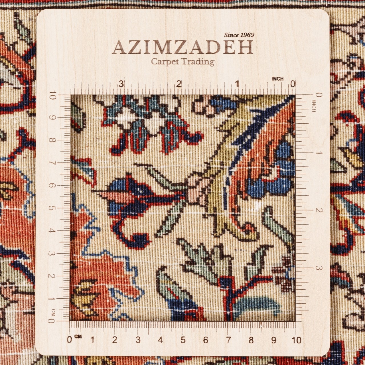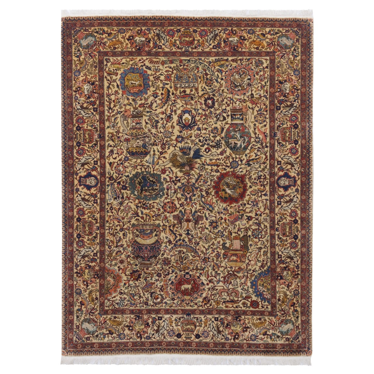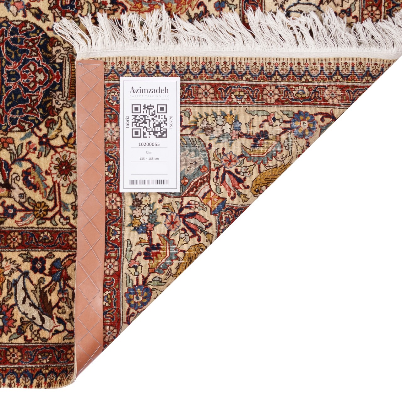 فرشی قدیمی و اصیل با طرح سراسر تبریز با ابعاد 135 × 185 سانتی‌متر و مساحت 2.5 مترمربع با نقش زیرخاکی، الهام‌گرفته از نقوش فراموش‌شده و کهن است، گویی لایه‌هایی از خاطره و هویت، دوباره بر بستر قالی جان گرفته‌اند. این فرش مستطیل شکل طرح سراسر، تمام بوم فرش را در بر گرفته و بدون مرز و قاب‌بندی، نغمه‌ای از نظم، تکرار و هماهنگی را به نمایش می‌گذارد. طرح سراسر از پرکاربردترین و چشم‌نوازترین شیوه‌های طراحی در قالی‌بافی ایران است که برخلاف طرح‌های مرکزگرا مانند لچک‌ ترنج، فاقد ترنج مرکزی و تقارن آشکار است و در آن، نقوش به‌صورت یکنواخت، متقارن یا نامتقارن، تمام سطح فرش را پوشش می‌دهند. فرش بافته شده از پشم مرغوب بر چله‌ی نخ است؛ ترکیبی سنتی و پرکاربرد با رجشمار 55، هم ظرافتی تحسین‌برانگیز پدید آورده و هم دوام و استحکام را تضمین کرده و گواهی‌ست بر توانایی بالای بافنده و دقتی که در اجرای نقش‌ها به‌کار رفته است. رنگ کرم در زمینه و حاشیه، فضایی آرام، گرم و یکپارچه پدید آورده که با دکوراسیون‌های سنتی و کلاسیک هماهنگ است و حضوری نرم و مؤثر خواهد داشت.