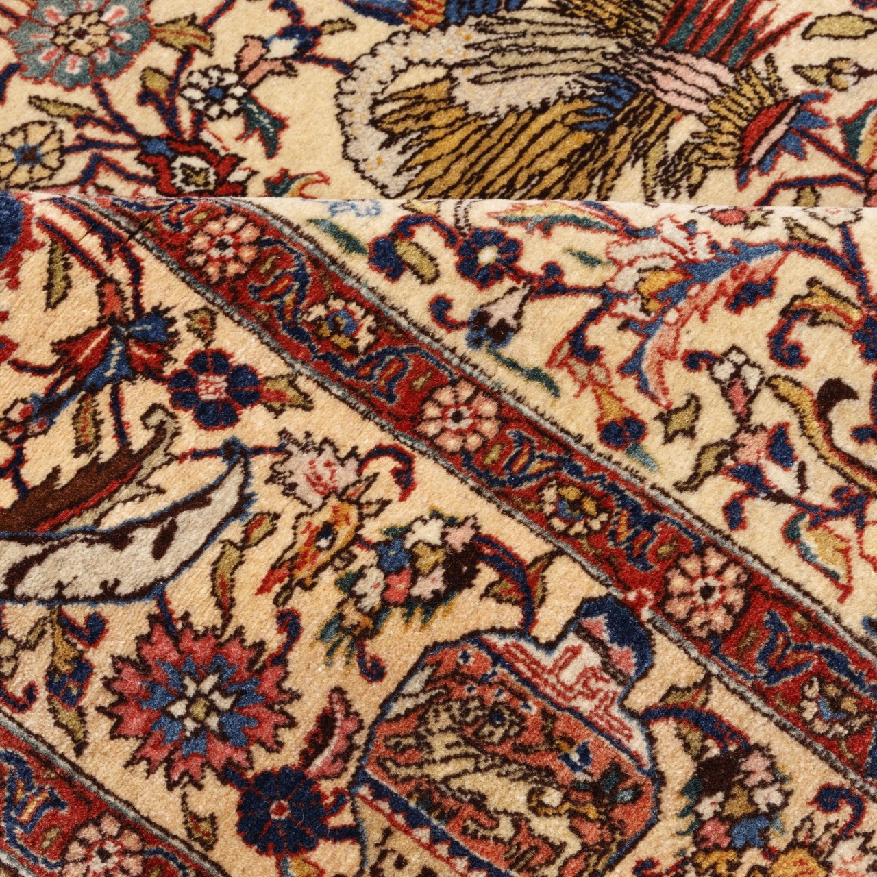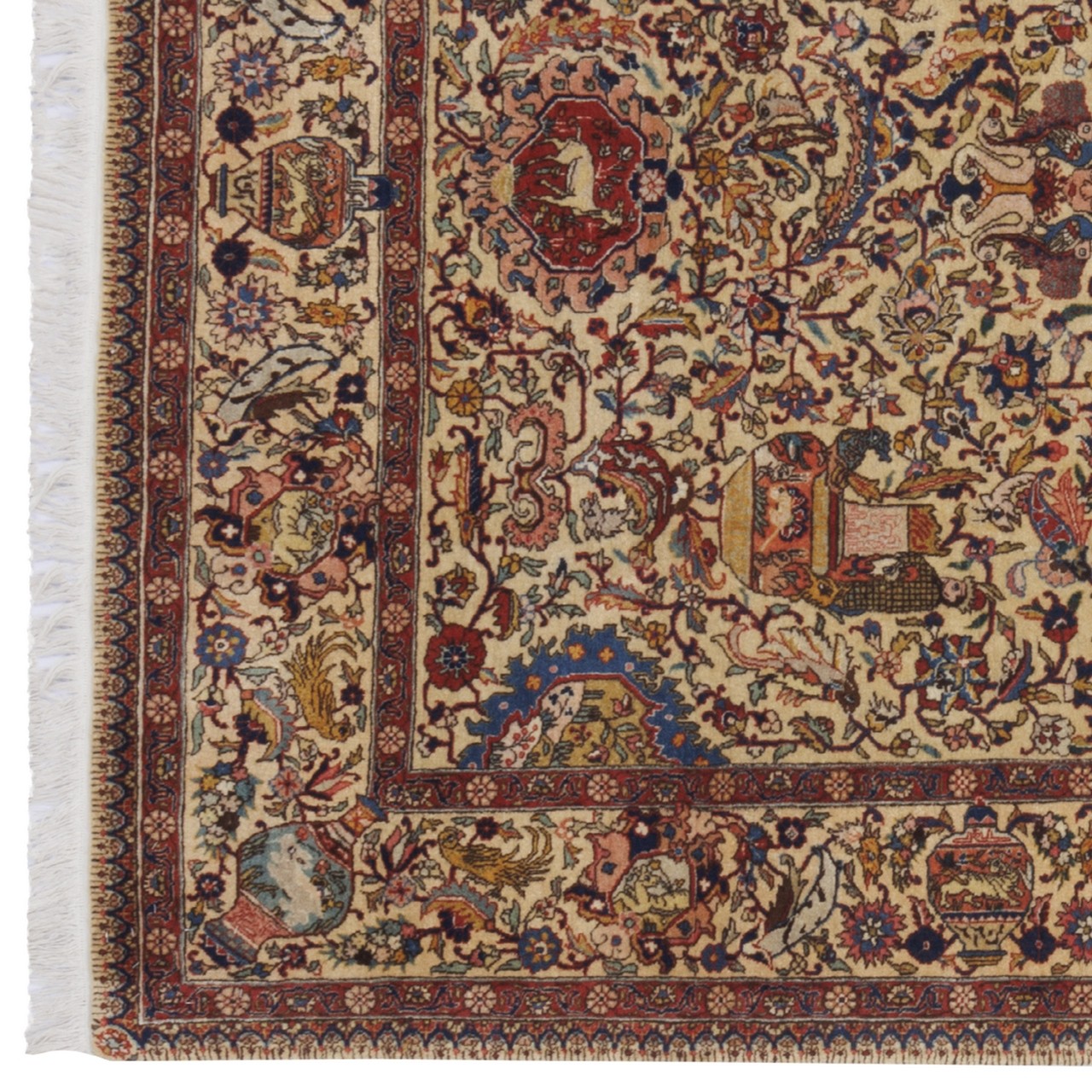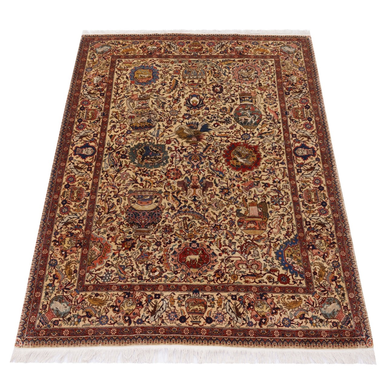فرشی قدیمی و اصیل با طرح سراسر تبریز با ابعاد 135 × 185 سانتی‌متر و مساحت 2.5 مترمربع با نقش زیرخاکی، الهام‌گرفته از نقوش فراموش‌شده و کهن است، گویی لایه‌هایی از خاطره و هویت، دوباره بر بستر قالی جان گرفته‌اند. این فرش مستطیل شکل طرح سراسر، تمام بوم فرش را در بر گرفته و بدون مرز و قاب‌بندی، نغمه‌ای از نظم، تکرار و هماهنگی را به نمایش می‌گذارد. طرح سراسر از پرکاربردترین و چشم‌نوازترین شیوه‌های طراحی در قالی‌بافی ایران است که برخلاف طرح‌های مرکزگرا مانند لچک‌ ترنج، فاقد ترنج مرکزی و تقارن آشکار است و در آن، نقوش به‌صورت یکنواخت، متقارن یا نامتقارن، تمام سطح فرش را پوشش می‌دهند. فرش بافته شده از پشم مرغوب بر چله‌ی نخ است؛ ترکیبی سنتی و پرکاربرد با رجشمار 55، هم ظرافتی تحسین‌برانگیز پدید آورده و هم دوام و استحکام را تضمین کرده و گواهی‌ست بر توانایی بالای بافنده و دقتی که در اجرای نقش‌ها به‌کار رفته است. رنگ کرم در زمینه و حاشیه، فضایی آرام، گرم و یکپارچه پدید آورده که با دکوراسیون‌های سنتی و کلاسیک هماهنگ است و حضوری نرم و مؤثر خواهد داشت.