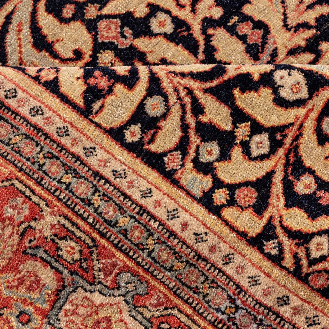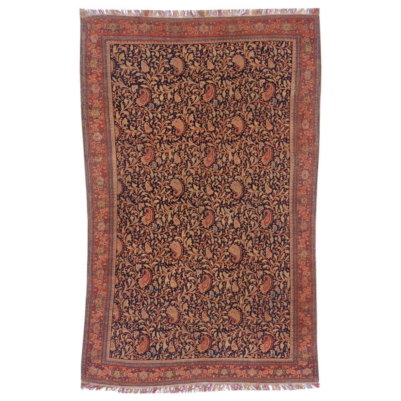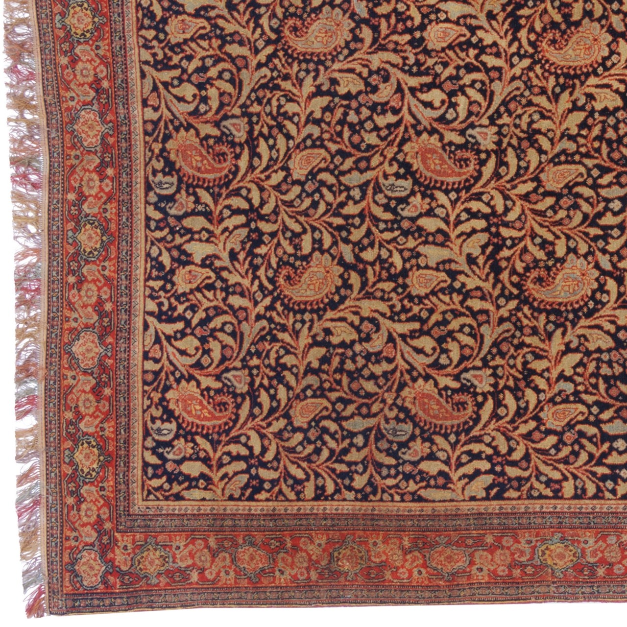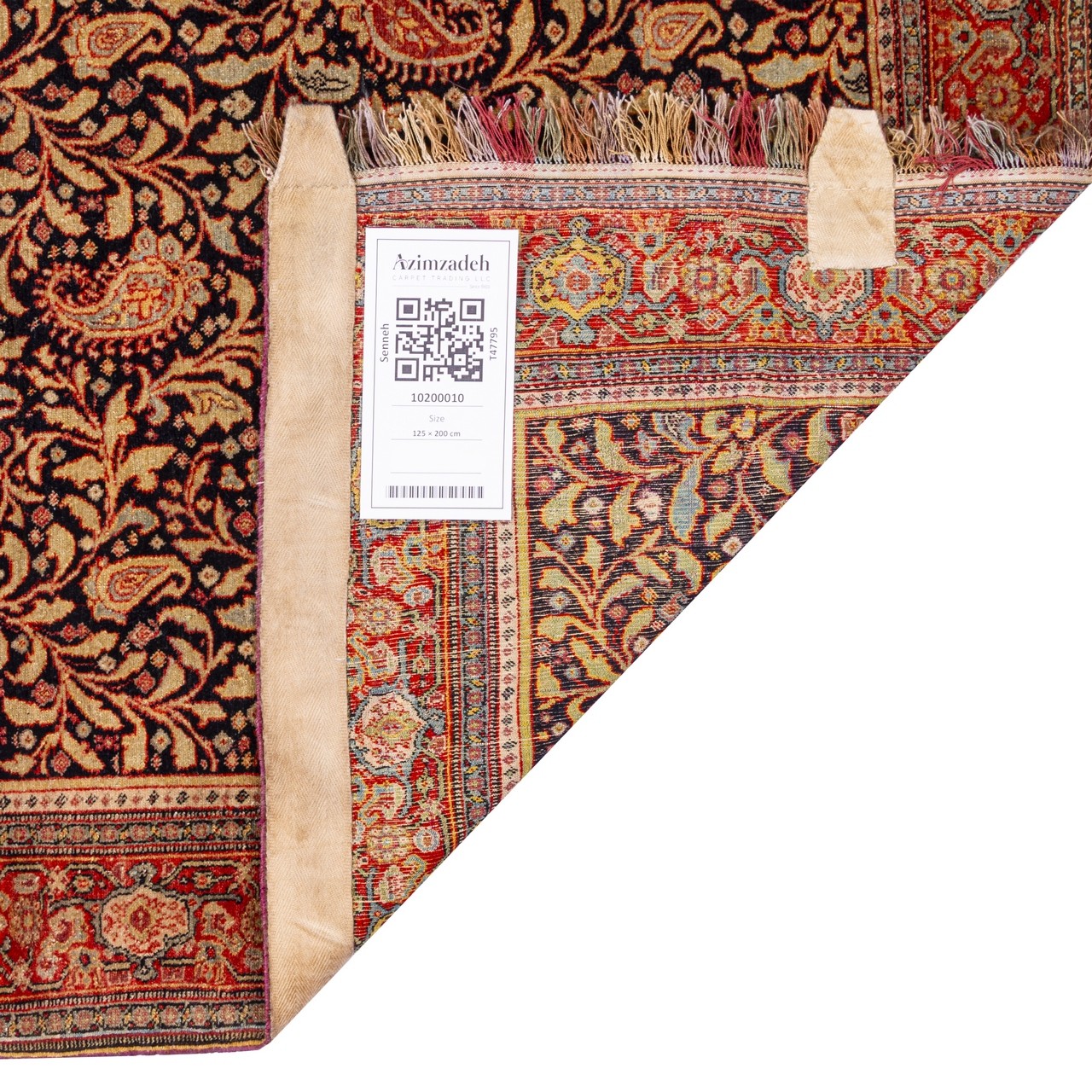 فرش آنتیک و کمنظیر سنه، نمایانگر اوج شکوه و اصالتِ هنرِ ناب کردستان است؛ سرزمینی که آوازهی فرشهای بینظیرش همواره زبانزد خاص و عام بوده است. این شاهکار هنری با طرح سراسر که تمام زمینهی آن را با زیبایی و هنرمندی بیبدیل گل و بته پوشانده، جلوهای استثنایی و فاخر به خود گرفته است. در این اثر کم نظیر، نقش مشهور «بته»، نماد جاودانگی و زندگی در فرهنگ ایرانی، با ظرافت و نظم هنرمندانهای بر سراسر زمینهی سرمهای عمیق و دلنشینِ آن تکرار شده است. این تکرار منظم و لطیف نقوش بته، همچون باغی از شکوفههای خیالانگیز است که چشم هر بینندهای را به سِیر در جهان رؤیاها و ظرافتها دعوت میکند. حاشیهای به رنگ لاکی، تضادی جذاب و هنرمندانه ایجاد کرده که ظرافتِ طراحی را بهشکل دوچندان به نمایش میگذارد. در دورهی صفویان، بته بهشدت گسترش یافت و در قالیبافی، قلمکار، پارچههای زربافت و کاشیکاری حضوری گسترده پیدا کرد. بته در این دوران بیشتر معنای تجلی حیات، رشد، و تداوم طبیعت را بهخود گرفت. استفاده از بهترین و مرغوبترین پشم در کنار چلهای از ابریشم نفیس و خاص هفترنگ، این فرش را به اثری بسیار ظریف، لطیف و درخشان بدل کرده است. چله ابریشمی هفترنگ، ویژگی منحصربهفردی است که علاوه بر استحکام، زیبایی و جلوهی رنگی بینظیری را نیز به این فرش بخشیده است. ریزبافتی با تراکم بالای ۶۰ رج، ظرافت هنرمندانه و دقت استادانهی هنرمندان سنه را آشکار میکند و باعث شده هر نقش و نگاری با وضوحی شگفتانگیز نمایان شود. ابعاد ۱۲۵ × ۲۰۰ سانتیمتری و مساحت ۲٫۵ مترمربعی این اثر نفیس، آن را برای تزیین فضاهای مجلل و لوکس بسیار مناسب ساخته است. این فرش آنتیک سنه، اثری هنری است که فرهنگ غنی ایرانی و اصالت و شکوه فرش کردستان را به زیبایی تمام به نمایش گذاشته و حضورش در هر فضایی، نشان از اصالت، سلیقهی خاص و شناخت عمیق از هنر والای ایرانزمین دارد.