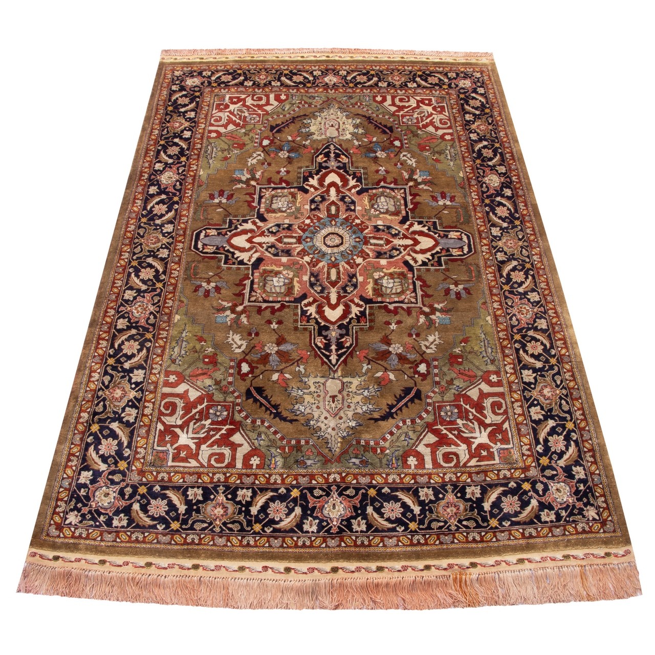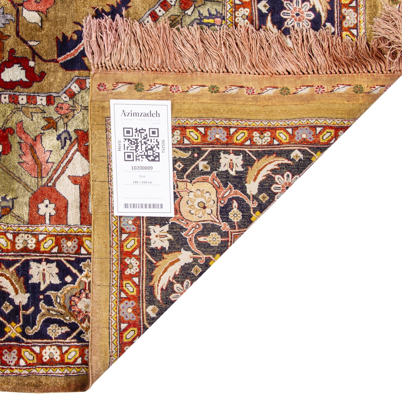 فرش آنتیک هریس، اثری نفیس و کمیاب است که هنر دست استادکاران پرآوازه خطۀ آذربایجان را در تار و پود خویش به زیبایی هرچه تمامتر نمایان کرده است. هریس که از دیرباز بهخاطر فرشهای منحصربهفرد با طرحهای هندسی فاخر و ماندگارش مشهور است، اینبار با خلق اثری بینظیر در طرح فاخر لچک ترنج، شکوه و اصالت هنر اصیل ایرانی را به تصویر کشیده است. طرح لچک ترنج در دوره صفویه به اوج رسید و تحت تأثیر معماری ایرانی مقرنسها و تزئینات کاشیکاری شکل گرفت. برخی پژوهشگران معتقدند که ریشهی آن به طراحی سقفهای گنبدیشکل و آیینهکاریهای ایرانی بازمیگردد. نقوش هندسی لچک و ترنج در این فرش، با ظرافتی مثالزدنی در هم آمیخته شده و به فرش جلوهای متقارن، منظم و چشمنواز بخشیدهاند؛ جلوهای که نمادی از تعادل و نظم در فرش ایرانی به شمار میرود. زمینهی زیتونیرنگ این فرش آنتیک، آرامش خاصی به محیط بخشیده و در ترکیب با حاشیۀ سرمهای، تضادی هنرمندانه و در عین حال هارمونیک را ایجاد نموده است. یکی از ویژگیهای خاص و منحصربهفرد این اثر، استفاده از نخ نقره و بافت «سوف» است؛ تکنیک ظریف و هنری خاص که به نقوش فرش جلوهای برجسته، درخشان و بیهمتا بخشیده است. ریزبافیِ کمنظیر آن با تراکم بسیار بالای ۶۰ رج، نشان از هنرمندی و ظرافت استثناییِ این فرش دارد و ظرافتِ هر نقش و نگار را با وضوحی کمنظیر به نمایش میگذارد. این فرش بافتهشده از ابریشم و پشم لطیف، بر چلهای مستحکم از نخ، از دوام، لطافت و ظرافت ویژهای برخوردار است. ابعاد ۱۴۰ × ۲۱۰ سانتیمتر و مساحت ۲٫۹۴ مترمربعیِ این فرش، آن را به انتخابی ایدهآل برای جلوهبخشی به فضاهای لوکس، کلاسیک و خاص تبدیل کرده است. این اثر هنری باشکوه از هریس، فراتر از یک فرش معمولی، قطعهای هنری است که هنر فاخر و ماندگار ایرانی را به بهترین شکل در دل خود دارد و به هر فضای خاصی، جلوهای اصیل، تاریخی و بینظیر خواهد بخشید.